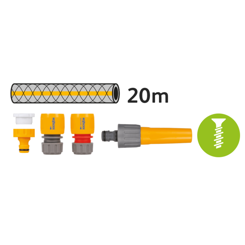 В комплект входят: Держатель HoZelock 2364 для шланга + шланг 20 м d12,5 мм; Коннектор для шланга Классик d12,5 - 15 мм (2070); Коннектор для шланга с Аквастоп d12,5 - 15 мм (2075); Наконечник для шланга (2292); Коннектор для крана с наружной резьбой диаметром 1/2" - 21 мм и 3/4" - 26,5 мм. (2184).