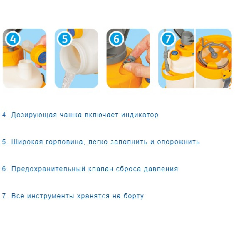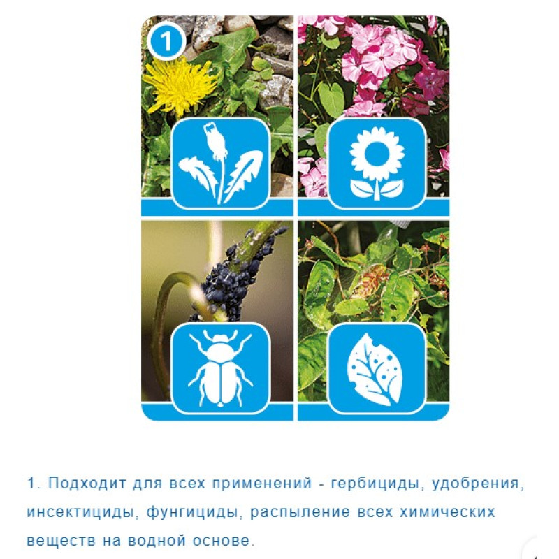 • Дозатор с уникальным индикатором раствора позволяет Вам установить, какой препарат Вы используете (фунгицид, гербицид, инсектицид или удобрение), чтобы избавить от необходимости запоминать, что Вы заливали последним.