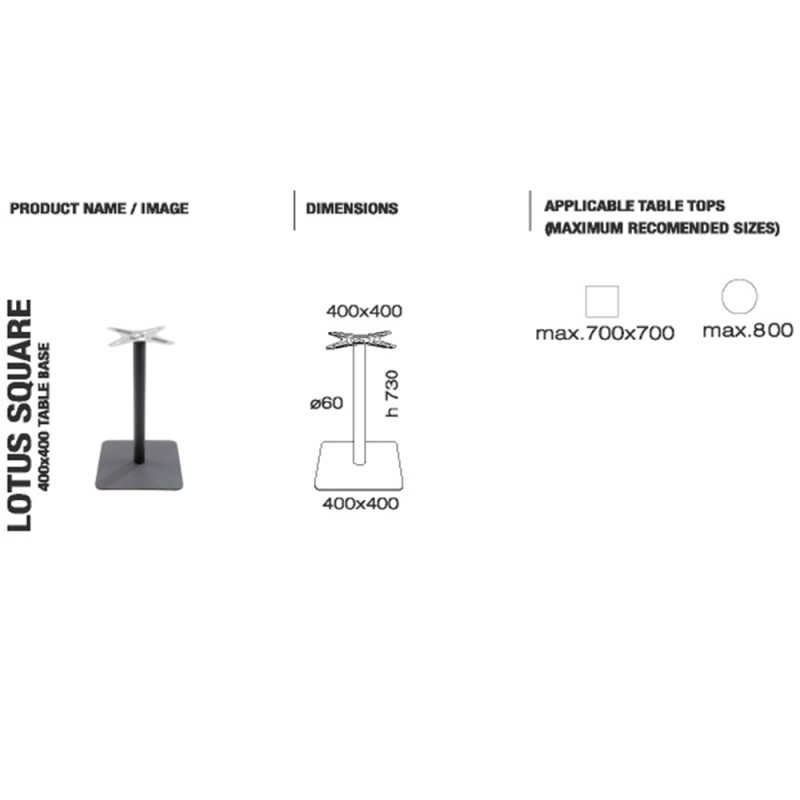 База стола Lotus Square 40x40x73 - опора для столів в сучасному стилі. Блиск і граціозність бази для столу привнесе в інтер'єр особливу гармонію і витонченість. Чудово поєднується з будь-якими стільцями, а стільницю можна підібрати з матеріалу на ваш розсуд: дерево, мармур, міцний пластик, МДФ, ламінована ДСП і інші. Простий монтаж опори до стільниці не вимагає специфічних знань, завдяки цьому Ви зможете з легкістю зробити для себе стильний офісний або обідній стіл. Можна використовувати на вулиці і в приміщенні.