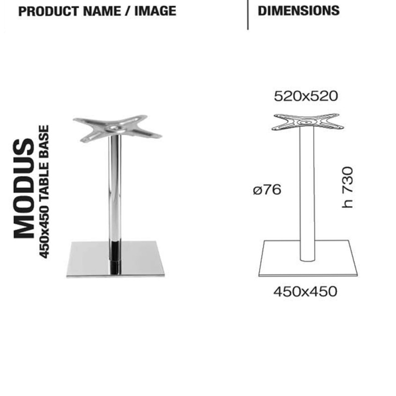 База стола Modus 45x45x73 см - опора для столів в сучасному стилі. Блиск і граціозність бази для столу привнесе в інтер'єр особливу гармонію і витонченість. Чудово поєднується зі стільцями на хромованих ніжках, стільницю можна підібрати з матеріалу на ваш розсуд: дерево, мармур, міцний пластик, МДФ, ламінована ДСП і інші. Простий монтаж опори до стільниці не вимагає специфічних знань, завдяки цьому Ви зможете з легкістю зробити для себе стильний офісний або обідній стіл. Використовувати тільки в приміщенні.