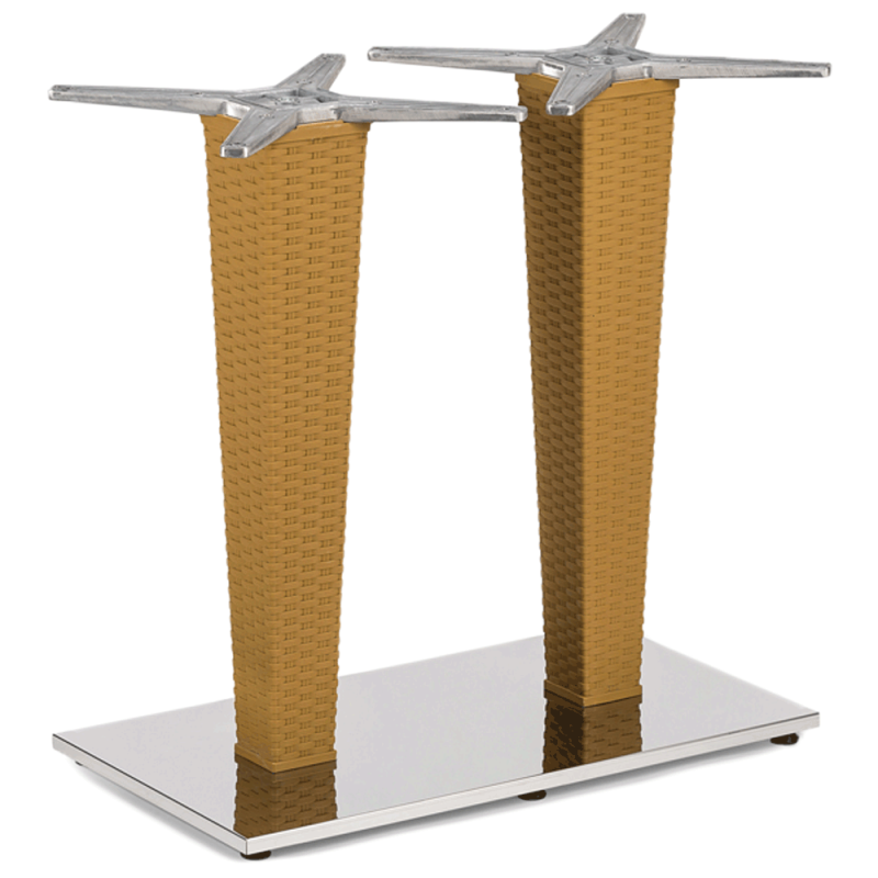 База столу Tilia Antares Double з подвійними ніжками максимально стійка і довговічна. Каркас металевий з плетінням під ротанг (поліетилен) і опорою з нержавіючої сталі. Висота і ухил регулюються, це дозволяє міцно встановити стіл навіть на нерівну поверхню. Підходить для комбінування зі стільницями Antares 70×70, 80×80, 80×120, 90×150. Для використання на вулиці біля басейну, в приміщенні ресторанів, обідніх кімнат і кухонь. Матеріали виробу стійкі до природних опадів, перепадів температур, впливу УФ випромінювання.