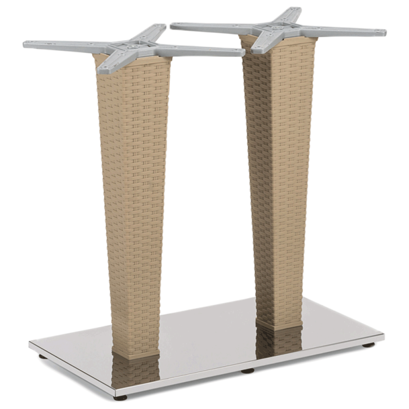 База столу Tilia Antares Double з подвійними ніжками максимально стійка і довговічна. Каркас металевий з плетінням під ротанг (поліетилен) і опорою з нержавіючої сталі. Висота і ухил регулюються, це дозволяє міцно встановити стіл навіть на нерівну поверхню. Підходить для комбінування зі стільницями Antares 70×70, 80×80, 80×120, 90×150. Для використання на вулиці біля басейну, в приміщенні ресторанів, обідніх кімнат і кухонь. Матеріали виробу стійкі до природних опадів, перепадів температур, впливу УФ випромінювання.