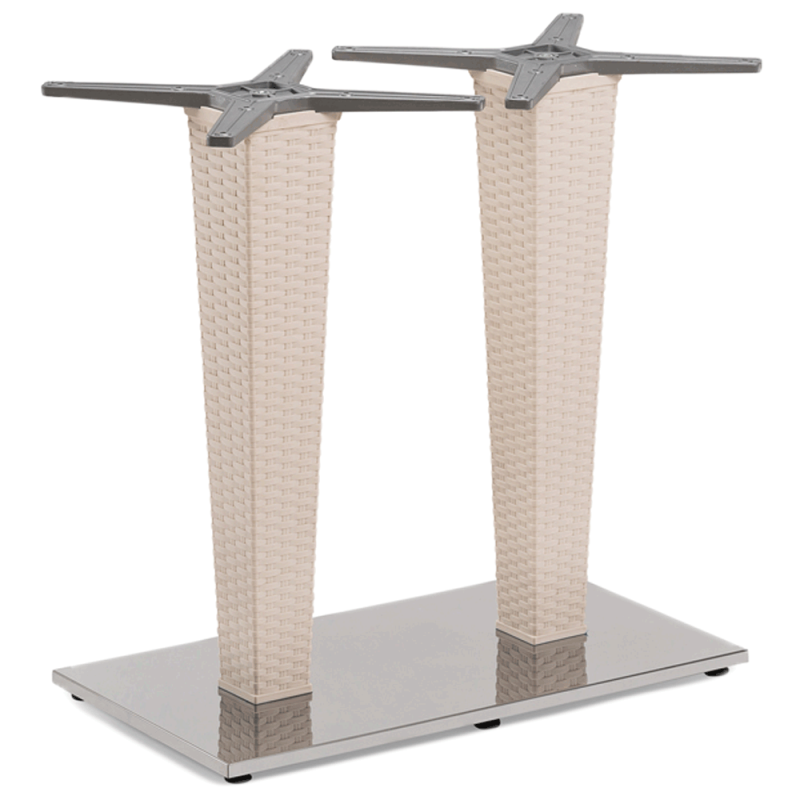 База столу Tilia Antares Double з подвійними ніжками максимально стійка і довговічна. Каркас металевий з плетінням під ротанг (поліетилен) і опорою з нержавіючої сталі. Висота і ухил регулюються, це дозволяє міцно встановити стіл навіть на нерівну поверхню. Підходить для комбінування зі стільницями Antares 70×70, 80×80, 80×120, 90×150. Для використання на вулиці біля басейну, в приміщенні ресторанів, обідніх кімнат і кухонь. Матеріали виробу стійкі до природних опадів, перепадів температур, впливу УФ випромінювання.