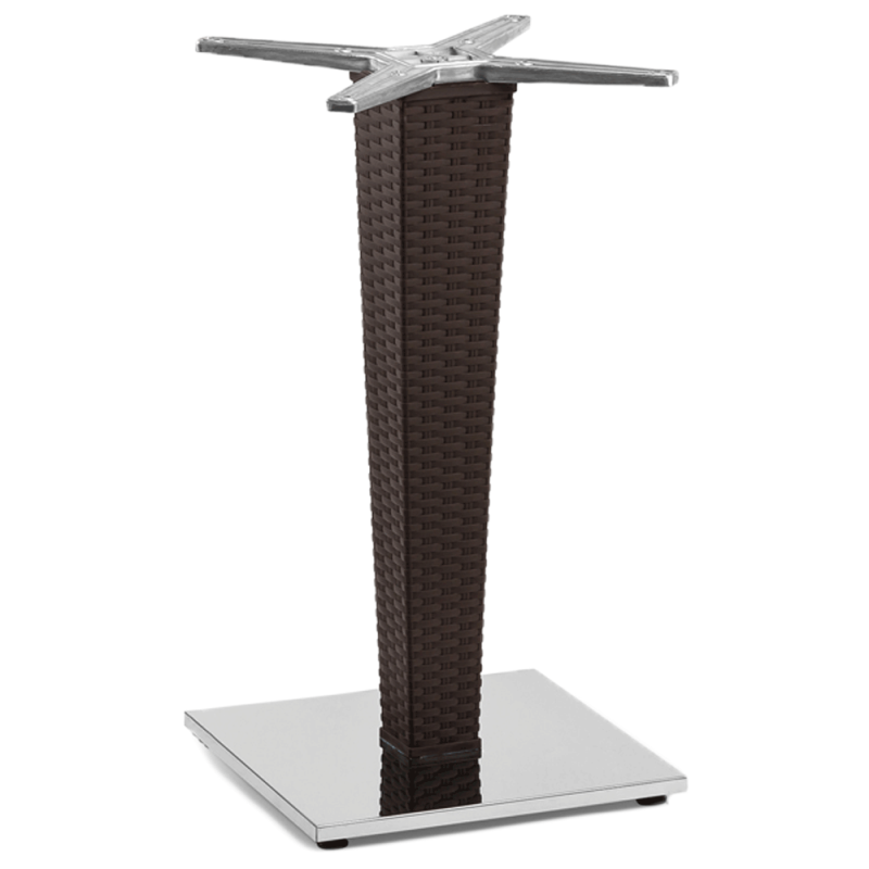 База столу Tilia Antares Single максимально стійка і довговічна. Каркас металевий з плетінням під ротанг (поліетилен) і опорою з нержавіючої сталі. Висота і ухил регулюються, це дозволяє міцно встановити стіл навіть на нерівну поверхню. Підходить для комбінування зі стільницями Antares 70×70, 80×80, 80×120, 90×150. Можна використовувати на вулиці біля басейну, в приміщенні ресторанів, обідніх кімнат і кухонь. Матеріали виробу стійкі до природних опадів, перепадів температур, впливу УФ випромінювання.