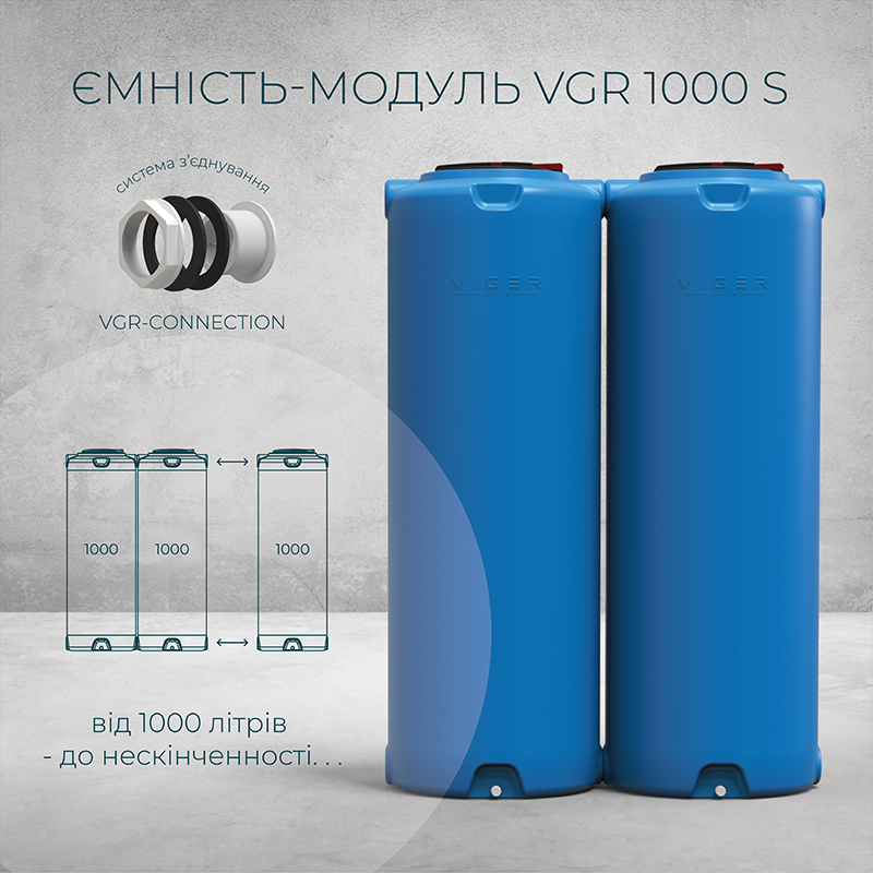Модульна пластикова ємність Viger об'ємом 1000 літрів є ідеальним рішенням для збору і зберігання води та інших харчових і технічних рідин. Її можна використовувати як для побутових, так і для промислових потреб. Конструкція пластикової ємності являє собою окремий модуль, що дозволяє за потреби збільшувати загальний об'єм шляхом з'єднання двох або більше ємностей між собою. Виготовлена ємність з високоякісного харчового пластику, що забезпечує довговічність, надійність використання та відсутність будь-якого запаху. Модульна конструкція дозволяє легко транспортувати та монтувати ємність, що робить її ідеальним вибором для тих, хто шукає ефективне та зручне рішення для зберігання рідин. Коннектор VGR-2 - застосовується для з'єднання двох та більше ємностей-модулів Viger. Даний з'єднувач складається з гайки, штуцера, упорного кільця та трьох гумових ущільнювачів. Гумові ущільнювачі, не стійкі до паливно мастильних матеріалів, при використанні ємностей для ПММ - ущільнювачі необхідно замінити на масло-бензостійкі. Конектор у комплект не входить.