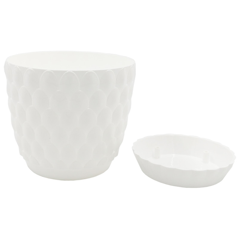 Горщик для квітів PINECON, має цікаву рельєфну фактуру. Пастельні кольори і яскравий глянець горщиків, гармонійно поєднуються між собою в одній композиції, прекрасно доповнюючи дитячу кімнату або спальню. До горщика з дренажними отворами, щільно прилягає підставка на засувках, що дозволяє лишкам води стікати, завдяки чому коріння рослин не псується. Виготовлений з поліпропілену, найбільш безпечний з усіх видів пластику - матеріал гнучкий, не має запаху, стійкий до вигорання кольору під впливом сонця.