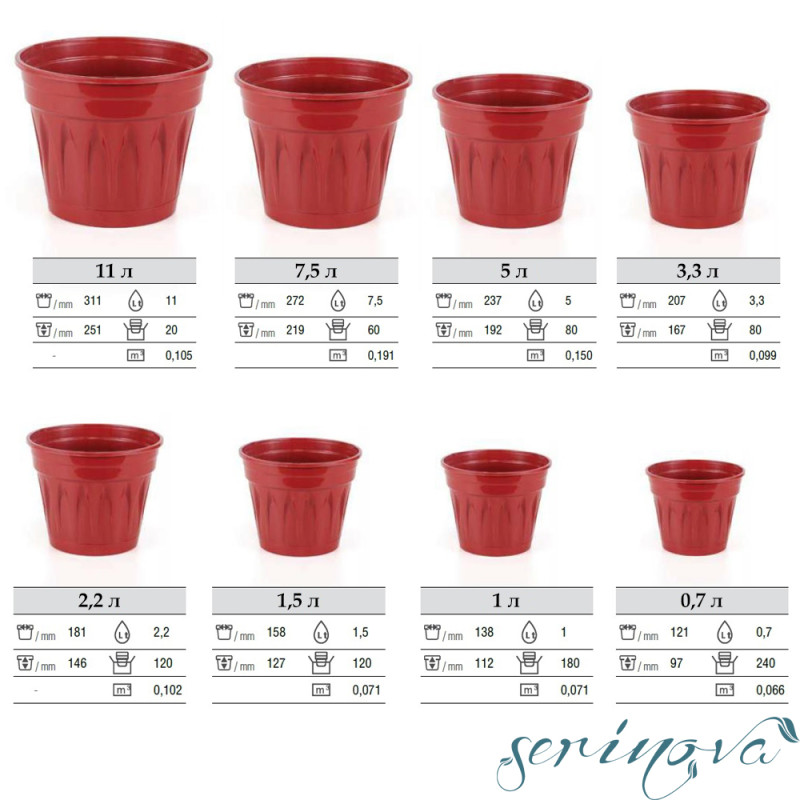 Горщик представлений в декількох об'ємах: 0,7 л; 1 л; 1,5 л; 2,2 л; 3,3 л; 5 л; 7,5 л; 11 л.