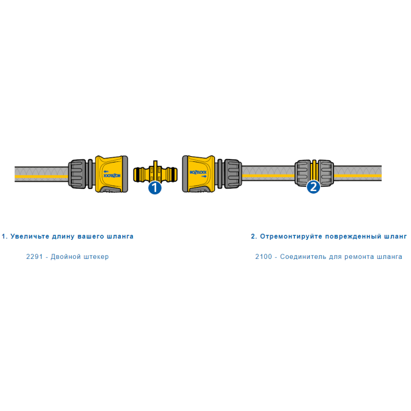 Конектор подвійний HoZelock. Охоплюваний конектор «тато» для з'єднання двох шлангів, з охоплюючими конекторами «мама» на кінцях. Використовується для з'єднання двох шлангів через конектори.
