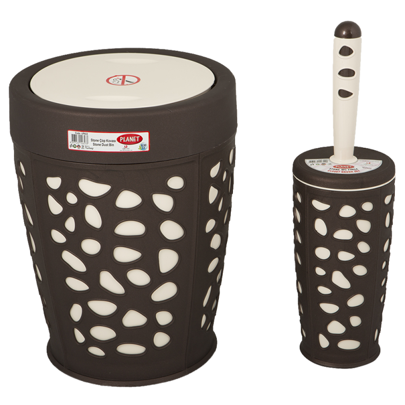 Лінійка наборів для ванної кімнати STONE має сучасний дизайн в поєднанні з функціональністю і практичністю. Особливістю даної моделі є рельєфний малюнок з переплетенням двох виробів. Палітра кольорів дає можливість підібрати набір під будь-який інтер'єр. Набір складається з двох предметів: щітка для туалету і корзина для сміття з поворотною кришкою, за допомогою якої не видно вмісту відра, що допоможе вам зробити ванну ще більш естетичною. У йоржика використана ліва різьба (при з'єднанні йоржа з ручкою, потрібно обертати йорж проти годинникової стрілки). Вироби зроблять вашу ванну більш затишною і різноманітною. Товар виготовлений з міцного пластику.