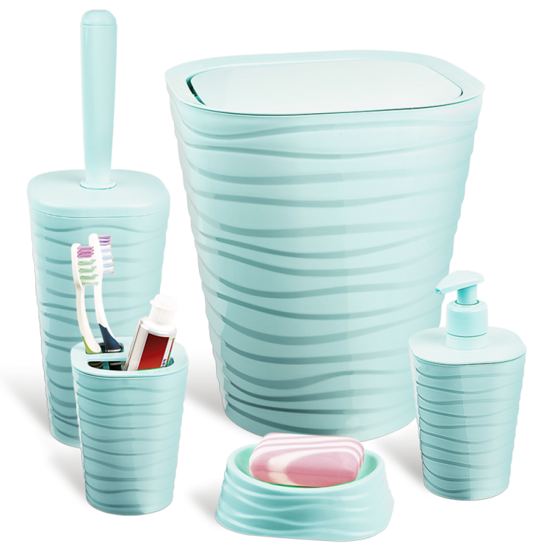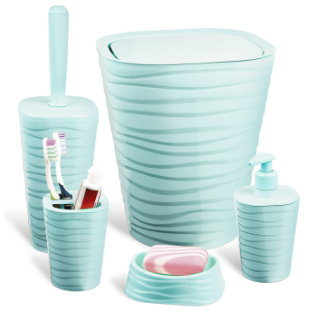 Лінійка наборів для ванної кімнати WELLE має сучасний дизайн в поєднанні з функціональністю і практичністю. Особливістю даної моделі є хвиляста структура виробу. Палітра пастельних кольорів дає можливість підібрати набір під будь-який інтер'єр. Набір складається з п'яти предметів: корзина для сміття, щітка для туалету, дозатор для рідкого мила, мильниця, органайзер для зубних щіток. У йоржика використана ліва різьба (при з'єднанні йоржа з ручкою, потрібно обертати йорж проти годинникової стрілки). Товар виготовлений з якісного пластика.