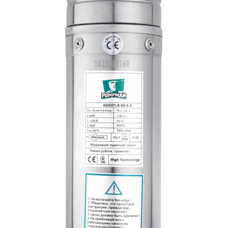 Максимальний напір, який може забезпечити насос заглибний шнековий Pumpman 4QGD 1.8-50 0,55 кВт, становить 130 метрів. В його рушійному механізмі є шнек з нержавіючої сталі, розташований усередині поліпропіленового стакана. Пристрій призначений для перекачування води зі свердловин і резервуарів для господарсько-побутових, а також виробничих потреб. Максимальна продуктивність — 30 літрів за хвилину або 1,8 метра кубічних на годину.