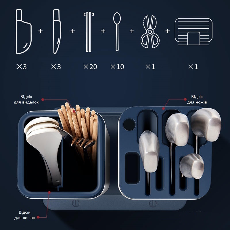 Багатофункціональний органайзер для кухонного приладдя забезпечує безпечне та зручне зберігання ножів, ложок, виделок та інших кухонних інструментів. Продуманий дизайн органайзера допомагає раціонально використовувати кухонний простір, а протиковзка основа запобігає його переміщенню. Він легко миється і чудово доповнить інтер'єр кухні завдяки своєму сучасному мінімалістичному стилю.