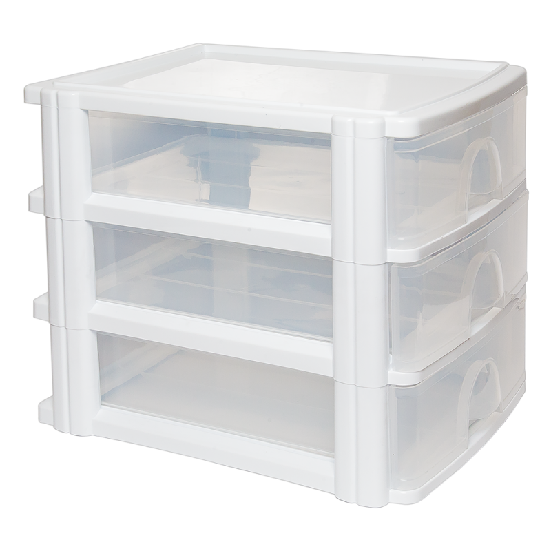 Комод-міні відмінне рішення для компактного і зручного зберігання дрібних речей . Міні комод має три прозорі висувні секції глибиною в 30 см під формат аркуша А4. Кожна секція виймається для зручного догляду. Виріб міцний і стійкий, виготовлений з якісного пластику.