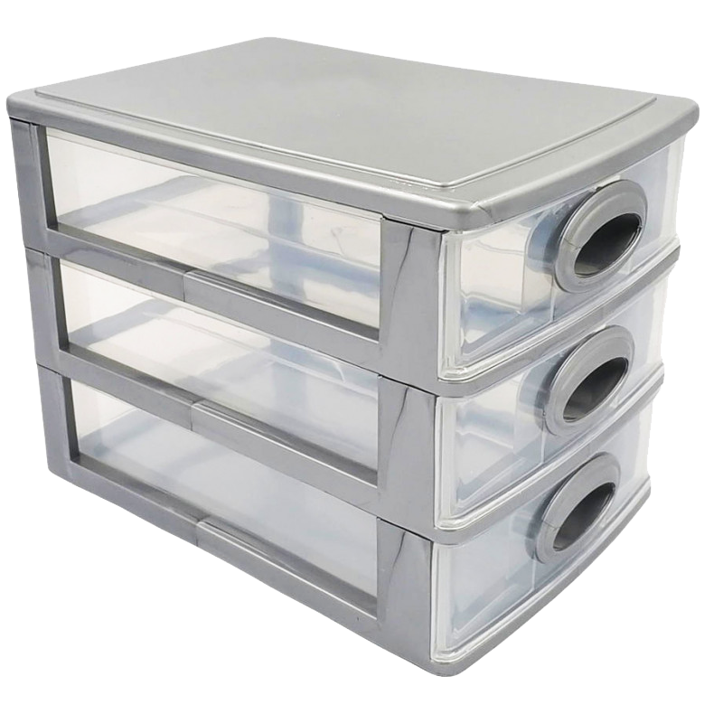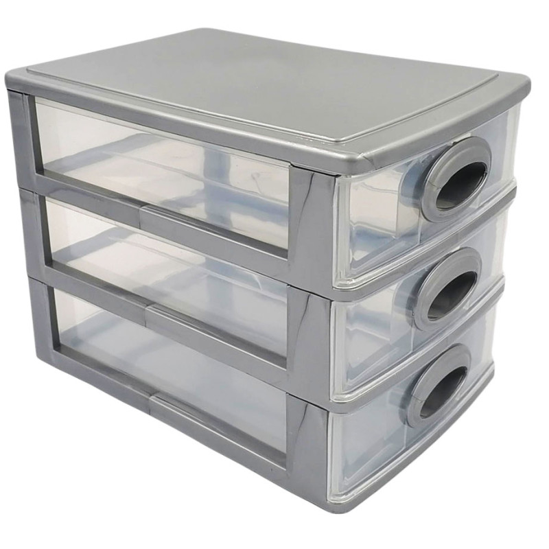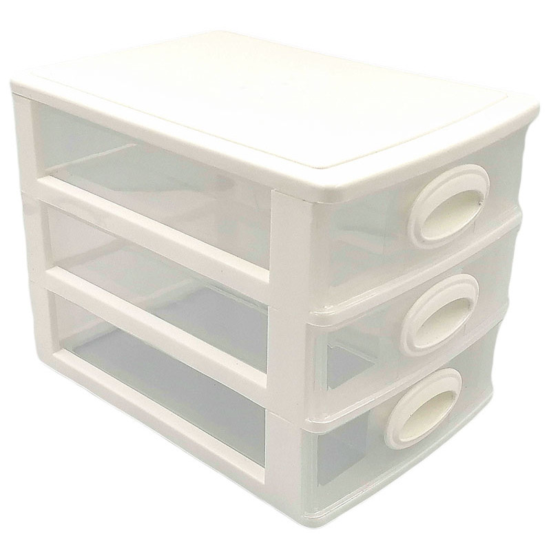 Комод-міні це відмінне рішення для компактного і зручного зберігання дрібних речей. Міні комод в спокійному забарвленні має три прозорі висувні секції, кожна секція виймається для зручного догляду. Виріб міцний і стійкий, виконаний з якісного пластику.