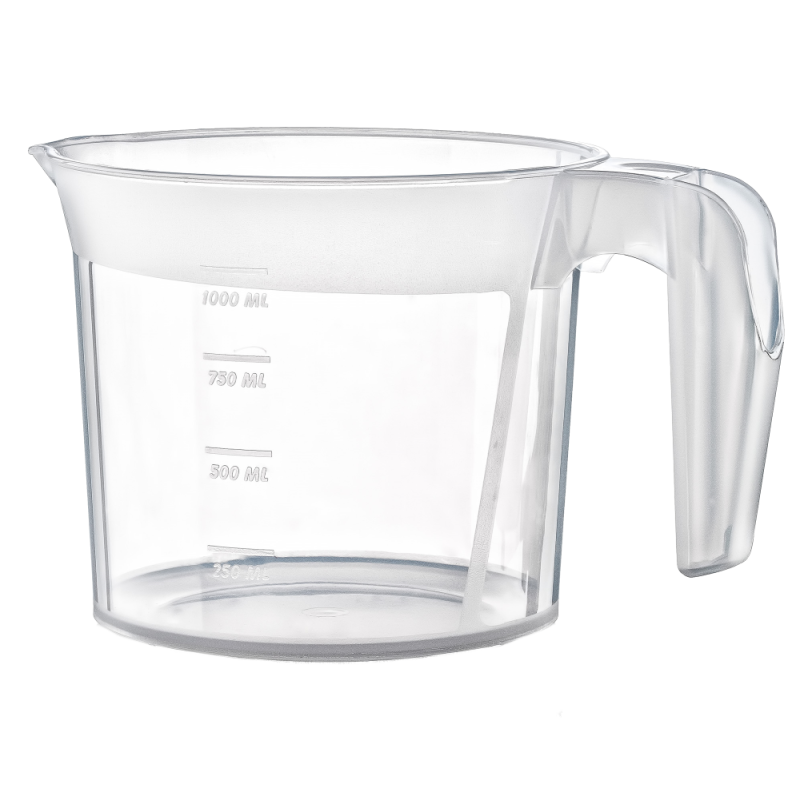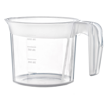 Пластикова мірна кружка використовується для вимірювання об'єму (літражу) рідин і продуктів харчування різних груп: питна вода, рослинна олія, молокопродукти, сік, алкоголь, мед, варення, борошно, крупи, зерна кави, горіхи, ягоди і багато іншого. Мірна кружка, виконана з пластмаси, в порівнянні зі скляними, металевими та іншими аналогами, має ряд переваг, а саме: легка вага; міцність - не б'ється, не тріскається, не деформується при ударі; держак становить одне ціле з основною частиною і не відбивається при падінні; прозорість, що дозволяє зробити точний вимір продукту; низька вартість.