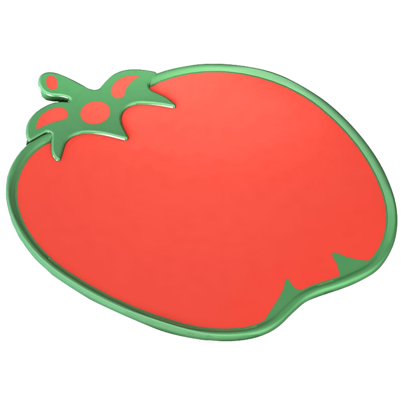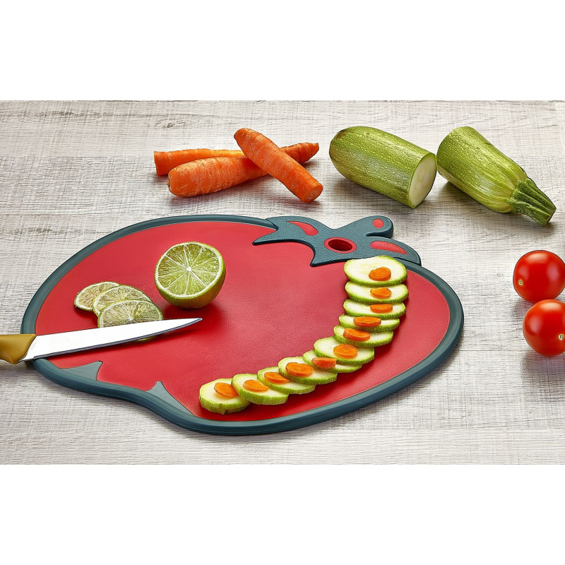 Дошка обробна в формі із забарвленням помідора - практичний і яскравий атрибут на кухні. Прогумовані края, запобігають ковзанню по столу, є отвір для підвішування. Виготовлена з якісного пластику, призначеного для контакту з харчовими продуктами.