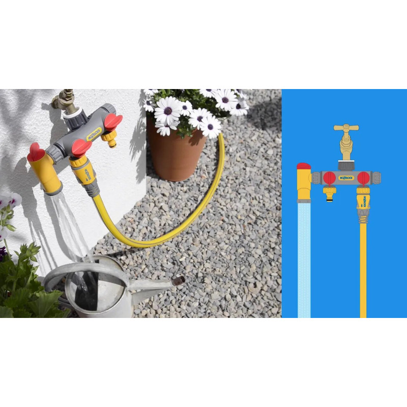 Двохшляховий роздільник потоків HoZelock з краном Flowmax. Роздільник потоків дозволяє перетворити з одного крана два окремих виходи та поворотний кран Flowmax. Поворотний кран направляє потік води в потрібний вам напрямок - це економить час і сили - не потрібно тримати відро або лійку під краном. Кран можна встановити на будь-яку зі сторін роздільника потоків HoZelock. Виходи з клапаном індивідуального управління потоком, це дозволяє використовувати всі одночасно або по одному.