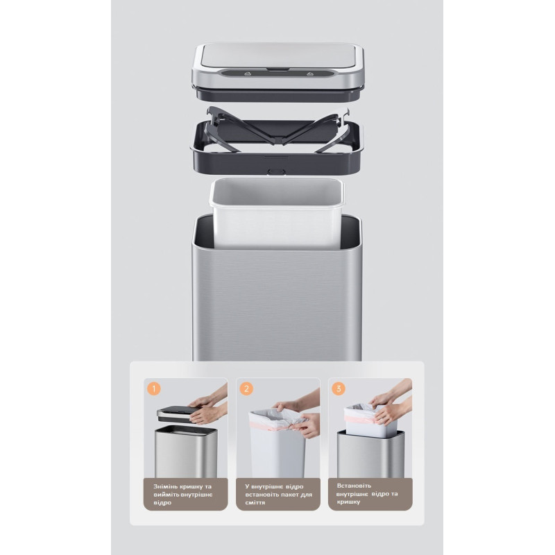 Способи відкриття кришки:Розташування: Для запобігання хибним спрацюванням, відро рекомендується використовувати тільки у відкритих просторах, не розміщуючи його в шафах.