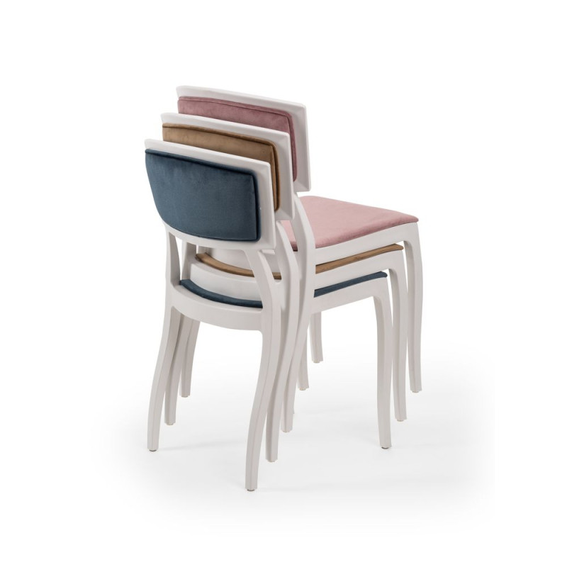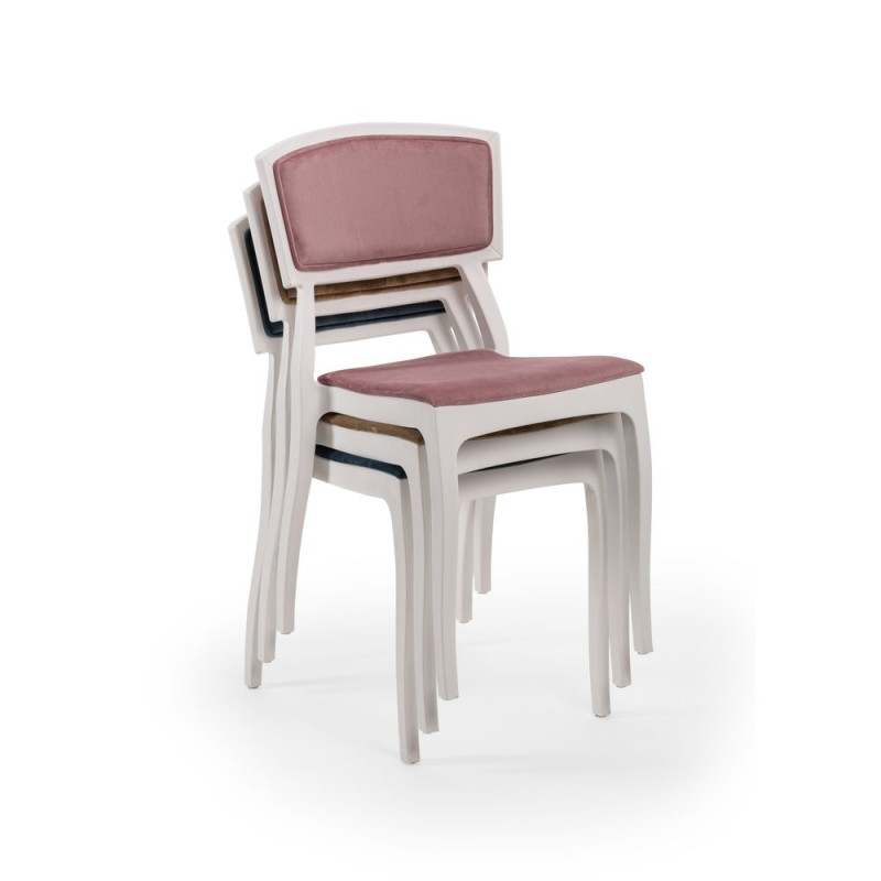 Стілець Orient з ніжками у формі букви S. Спинка стільця відрізняється особливим комфортом. Стілець Orient легкий і практичний. Сидіння оббиті оксамитовою водовідштовхуючою тканиною. Матеріал виробу поліпропілен посилений скловолокном, завдяки чому виріб стійкий до низьких і високих температур, вологості. Ніжки оснащені заглушками проти ковзання по підлозі. Вироби штабелюються.