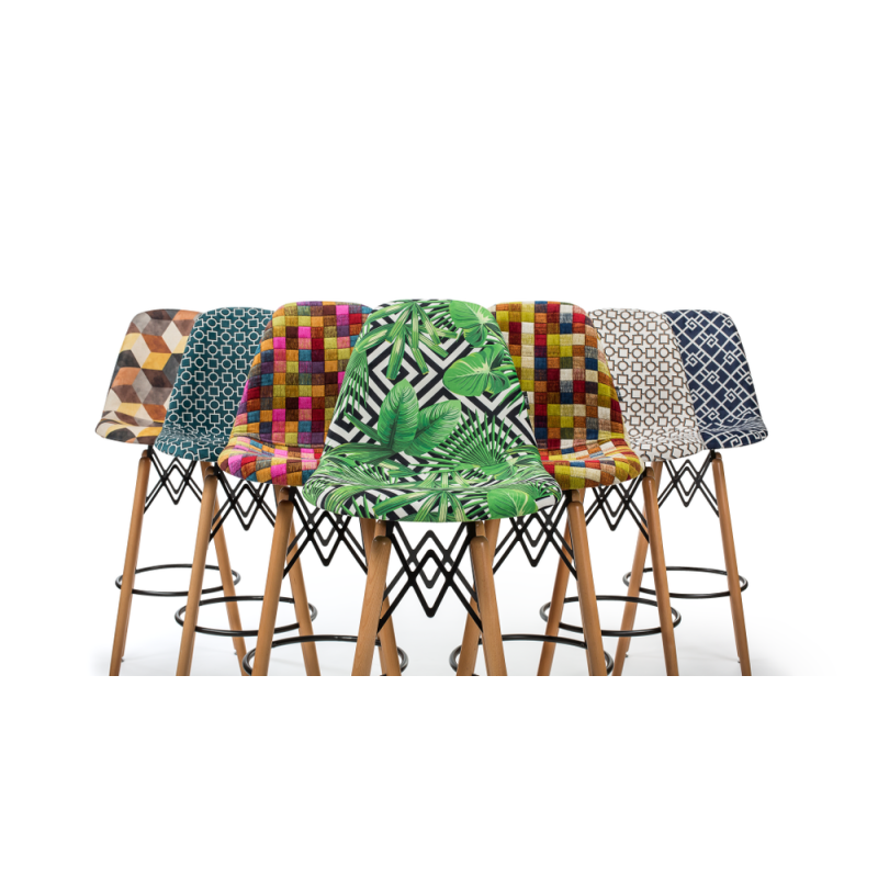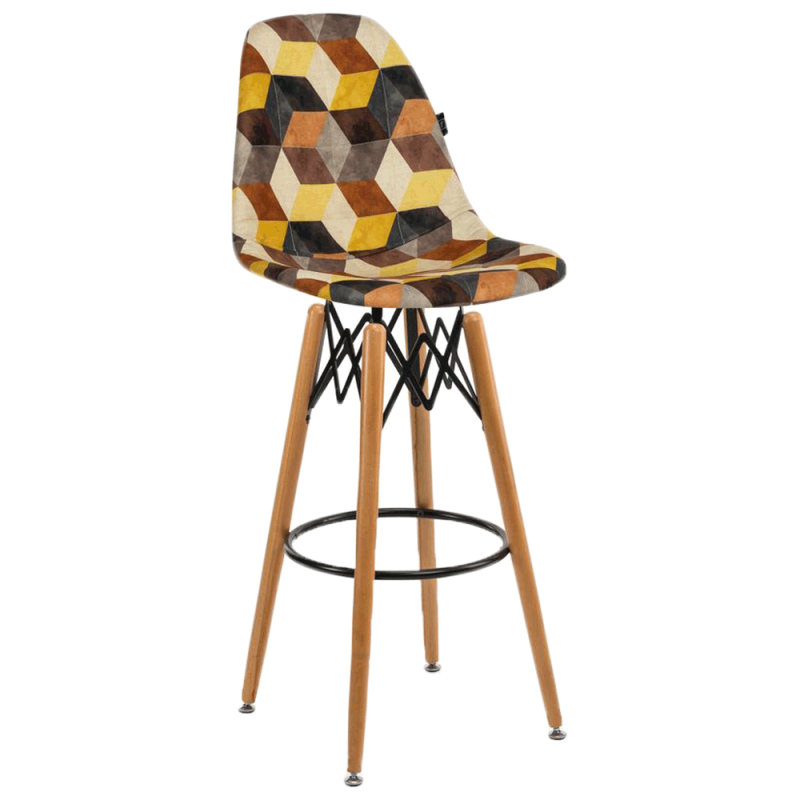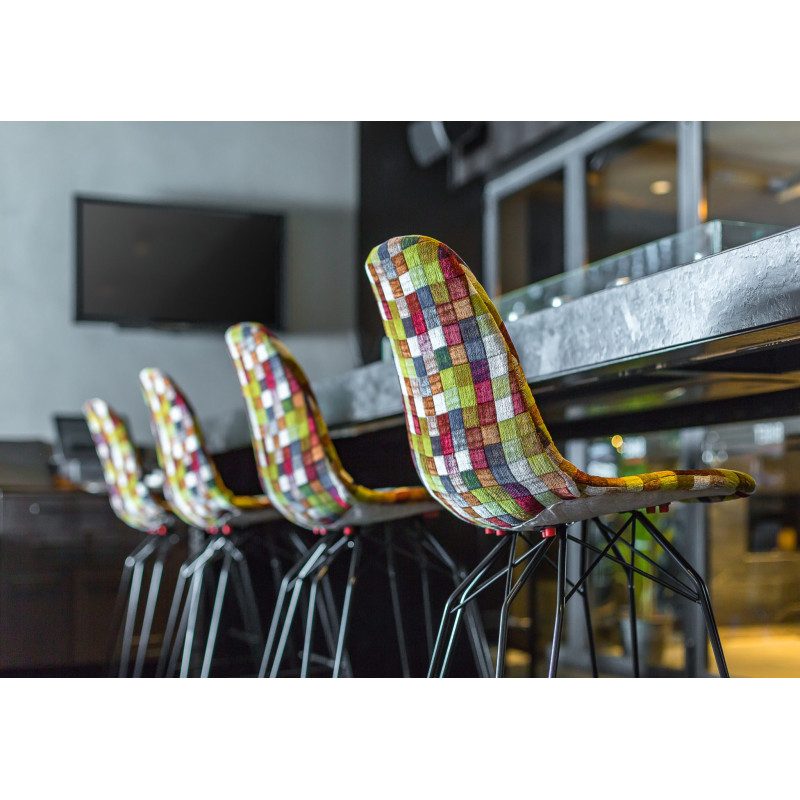 Стілець Eos-V Bar Pad відрізняється елегантним поєднанням різних тканин. EOS це нова надихаюча марка поп-арт культури, підходить для використання практично в будь-якому місці. Барний стілець ідеально підходить для будинку, їдальні. Конусні міцні ніжки виготовлені з масиву натурального дерева бук з оригінальними металевими опорами, є зручна кільцева перекладина для ніг.