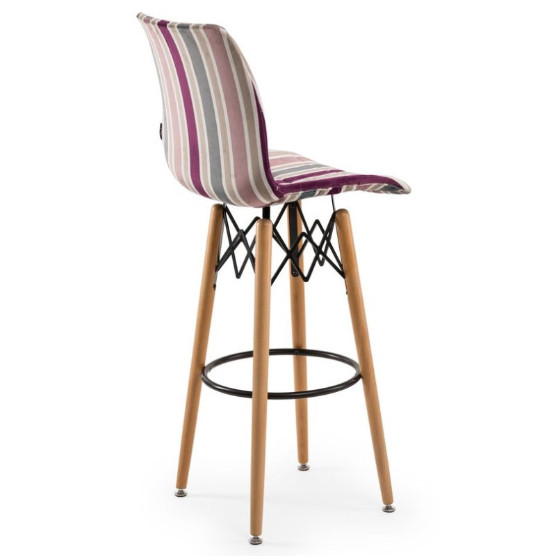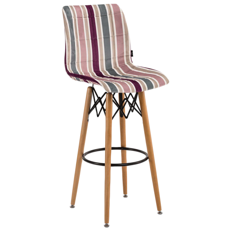 Барний стілець Laser-V практичний і зручний, ідеально підходить для інтер'єру кухні і їдальні. Також буде практичний в експлуатації в клубах, ресторанах і офісах. Сидіння має тканинну оббивку з барвистою тканиною. Рекомендується для використання в приміщенні. Конусні міцні ніжки з оригінальними металевими опорами виготовлені з масиву натурального дерева бук, оснащені заглушками проти ковзання по підлозі.