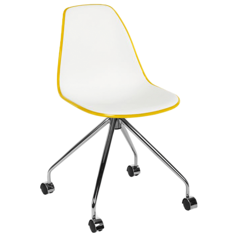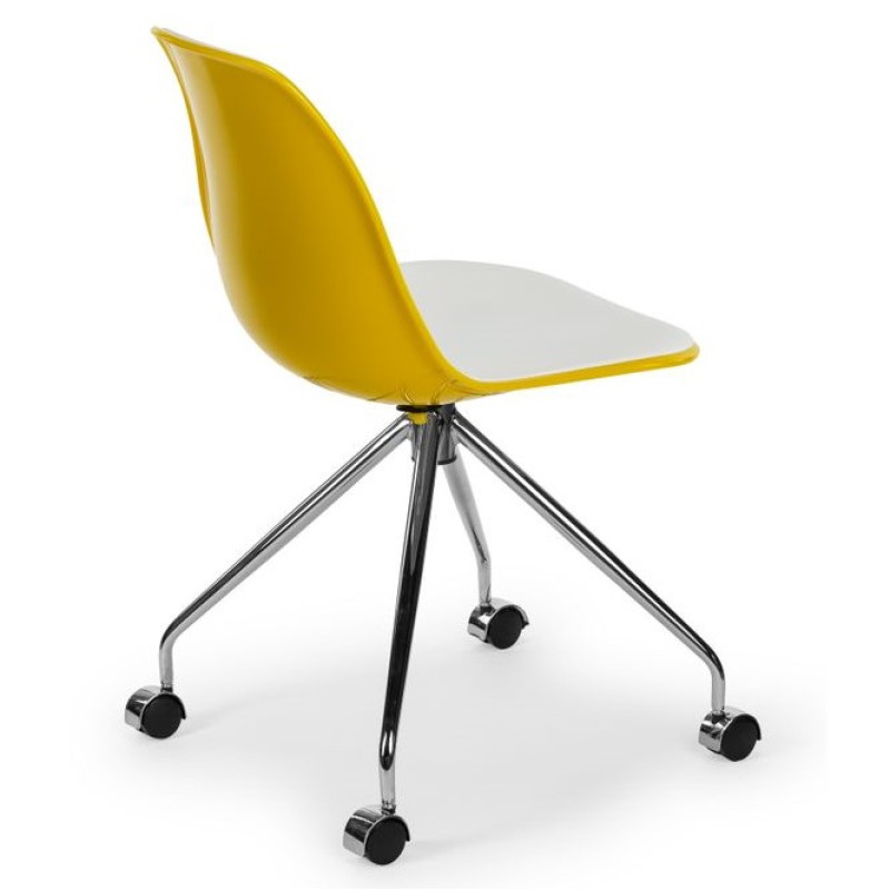 Даний стілець відрізняється міцністю і довговічністю, сучасний пластик проходить спеціальну обробку ще на етапі виробництва. Опорний блок стільця складається з чотирьох хромованих ніжок, на колесах.