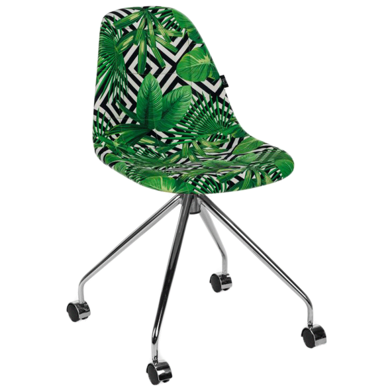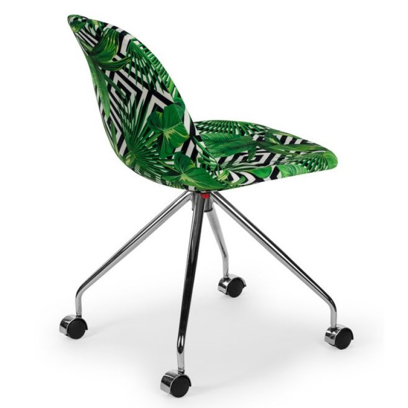 Стілець має практичну тканинну оббивку різного забарвлення. Опорний блок стільця складається з чотирьох хромованих ніжок, на колесах.