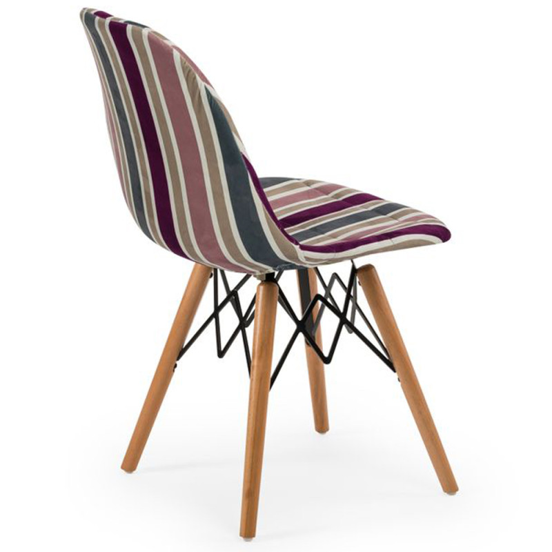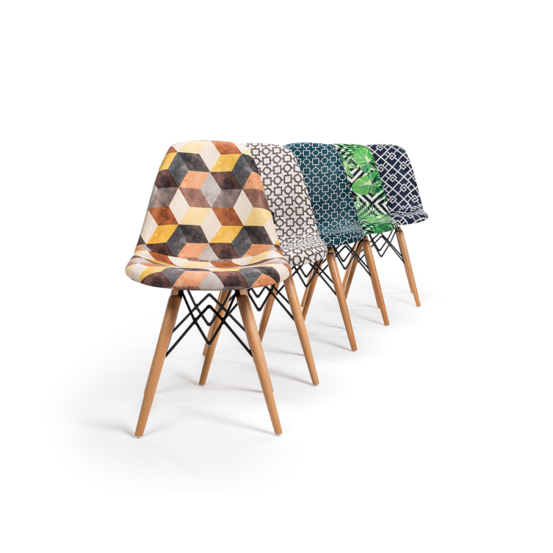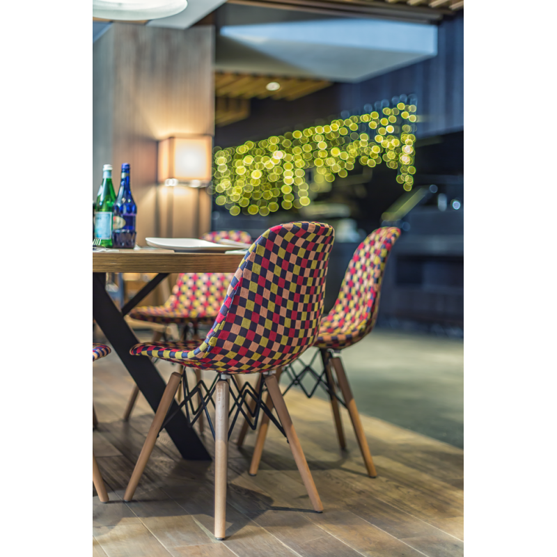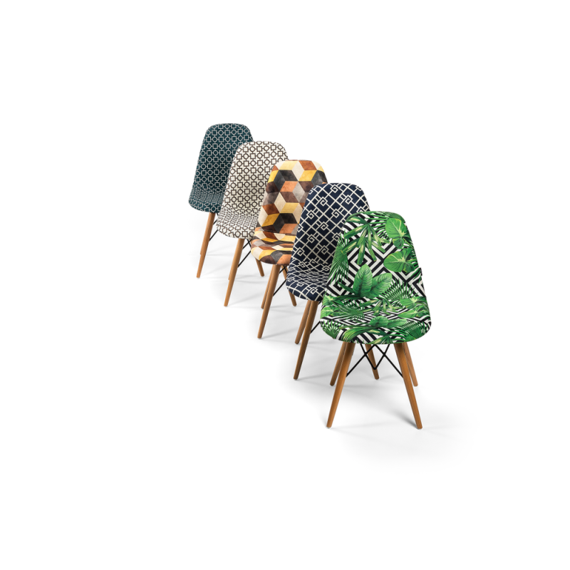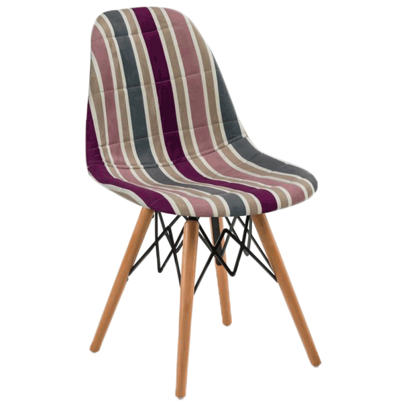 Стільці Eos-V відрізняються елегантним поєднанням різних тканин. EOS це нова надихаюча марка поп-арт культури, підходить для використання практично в будь-якому місці. Стілець ідеально підходить для будинку, їдальні, а також прекрасно вписується в офіси, кабінети і кімнати очікувань. Конусні міцні ніжки виготовлені з масиву натурального дерева бук, з оригінальними металевими опорами.