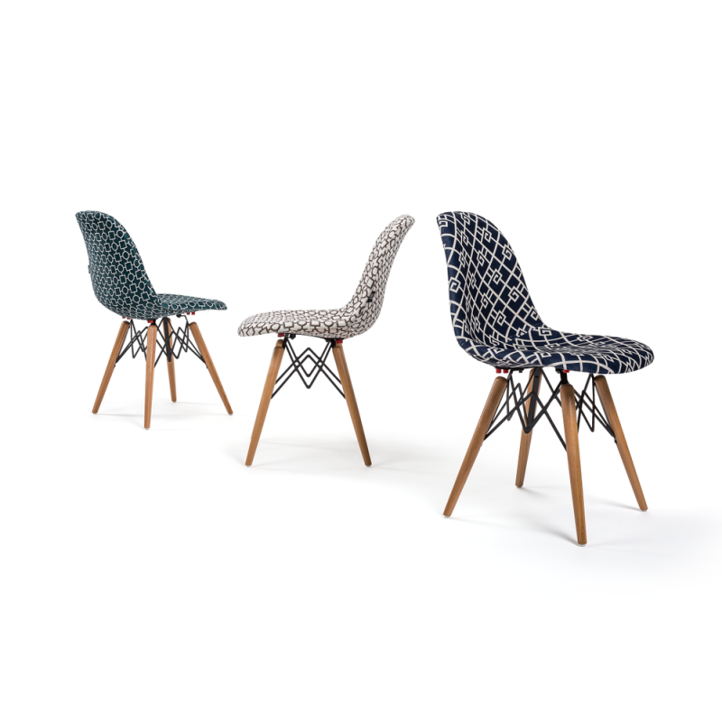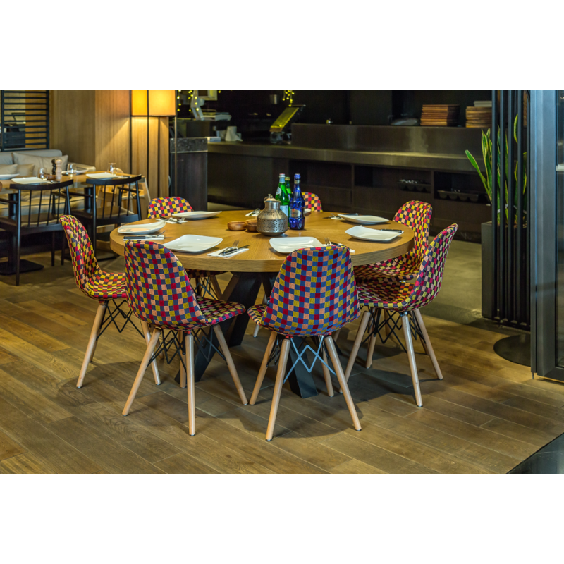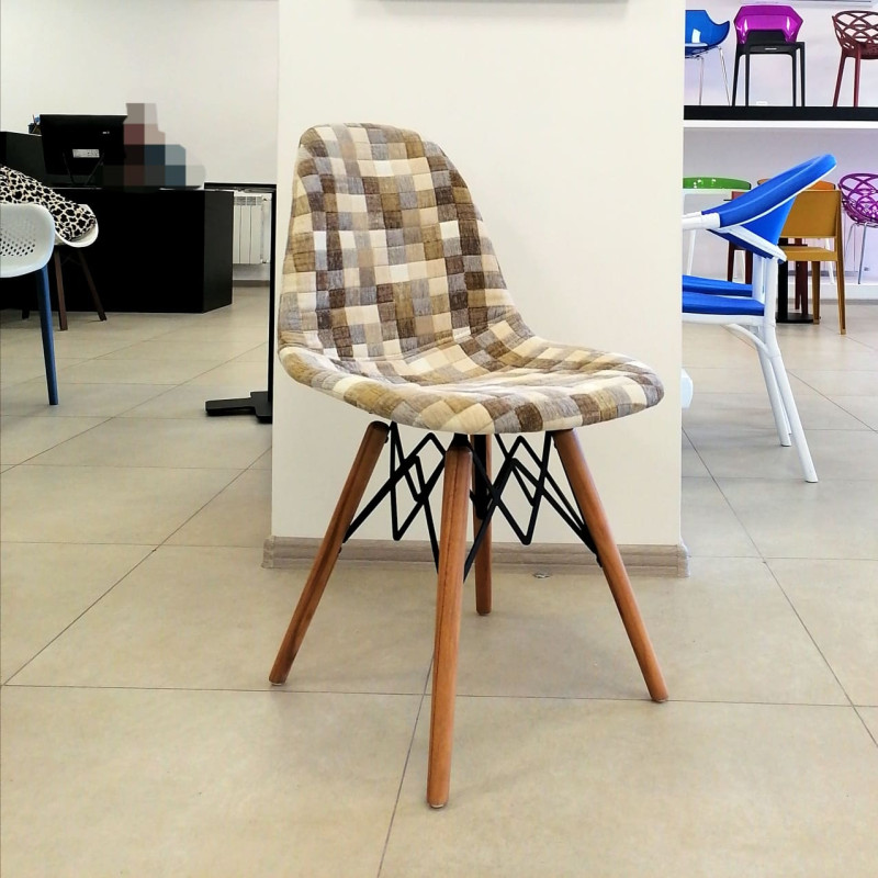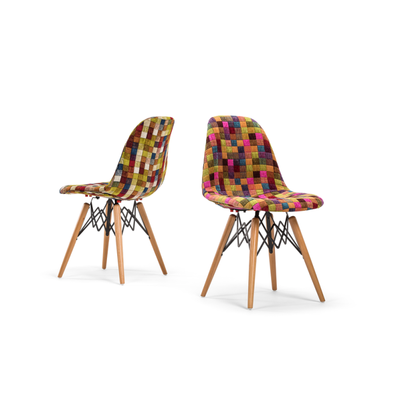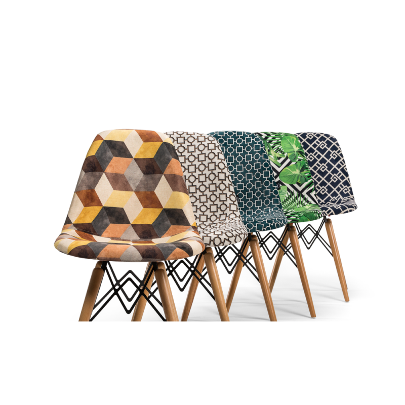 Стільці Eos-V відрізняються елегантним поєднанням різних тканин. EOS це нова надихаюча марка поп-арт культури, підходить для використання практично в будь-якому місці. Стілець ідеально підходить для будинку, їдальні, а також прекрасно вписується в офіси, кабінети і кімнати очікувань. Конусні міцні ніжки виготовлені з масиву натурального дерева бук, з оригінальними металевими опорами.