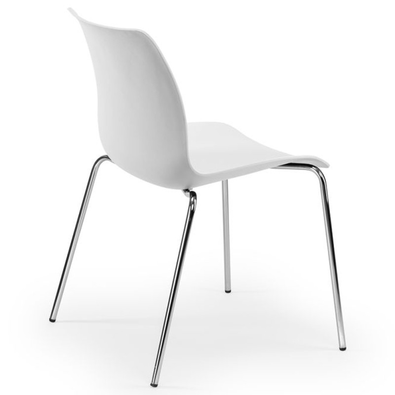 Стілець Laser практичний і зручний, який ідеально вписується в кухню і їдальню. Підходить для громадських місць, таких як клуби, ресторани, офіси. Стілець матовий, матеріал поліпропілен посилений скловолокном, завдяки чому виріб стійкий до низьких і високих температур, вологості, а також забезпечує високу міцність і довгий термін експлуатації. Ніжки і рама металеві, хромовані ?14 мм, оснащені заглушками проти ковзання по підлозі.