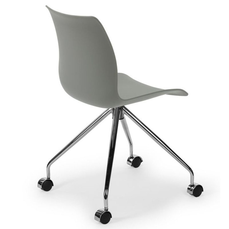 Стілець Laser-O практичний і зручний, який ідеально вписується в кухню і їдальню. Також ідеально підходить для громадських місць, таких як клуби, ресторани, офіси. Стілець матовий, матеріал поліпропілен посилений скловолокном, завдяки чому виріб стійкий до низьких і високих температур, вологості, а також забезпечує високу міцність і довгий термін експлуатації. Ніжки і рама металеві, хромовані, комплектуються роликами, забезпечуючи кріслу мобільність.