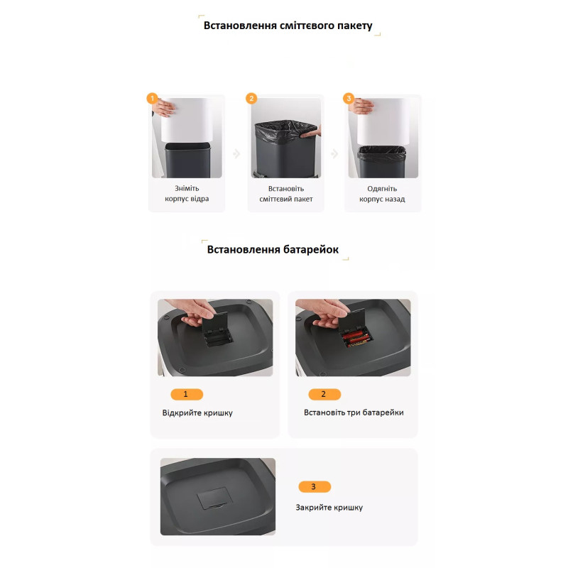 Це сміттєве відро ідеально підходить для тих, хто цінує комфорт і чистоту, забезпечуючи безконтактну роботу. Незамінний елемент сучасних інтер’єрів, де важливо поєднання зручності та гігієни.