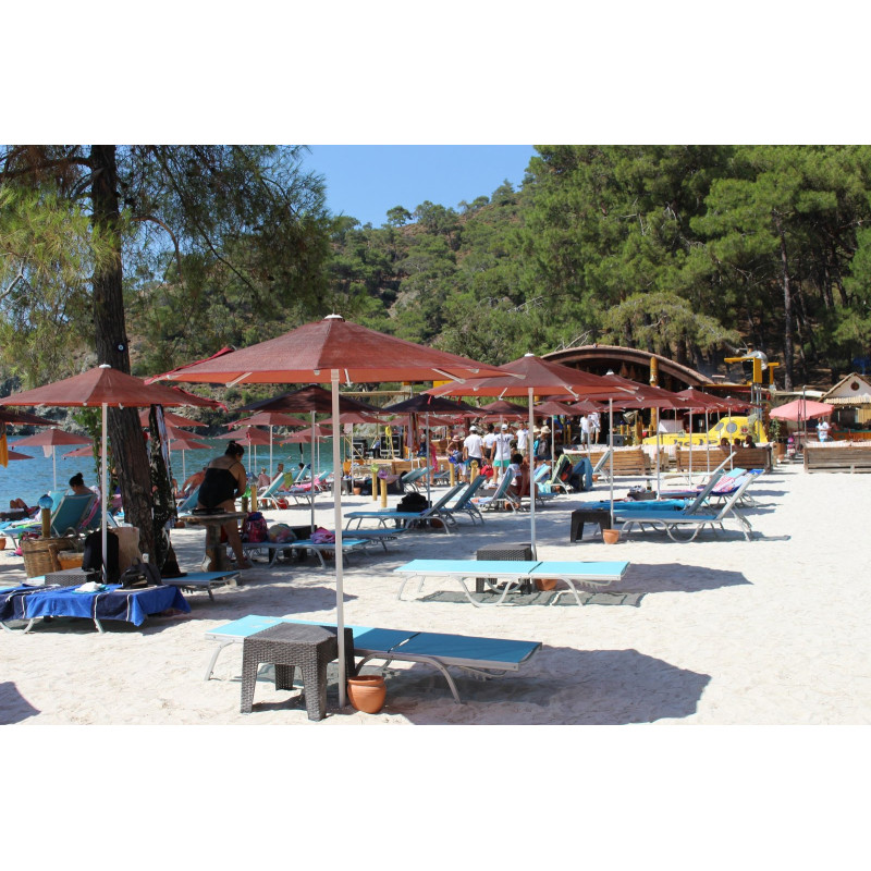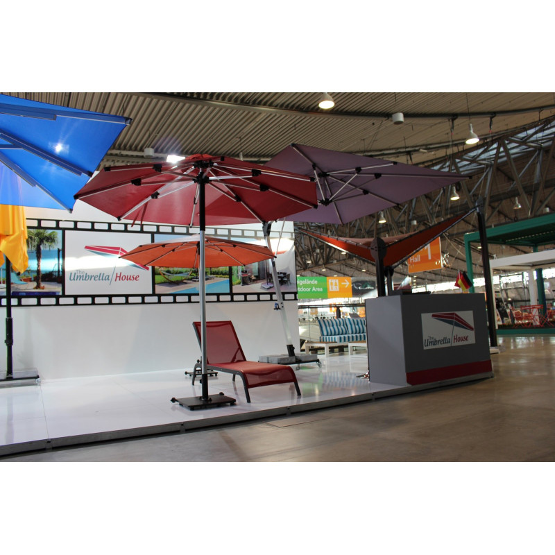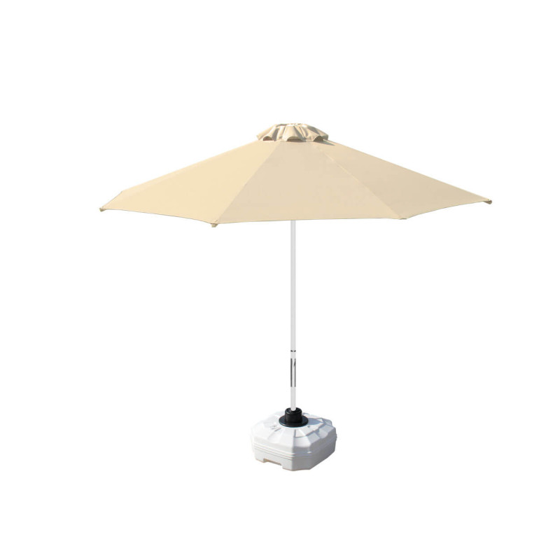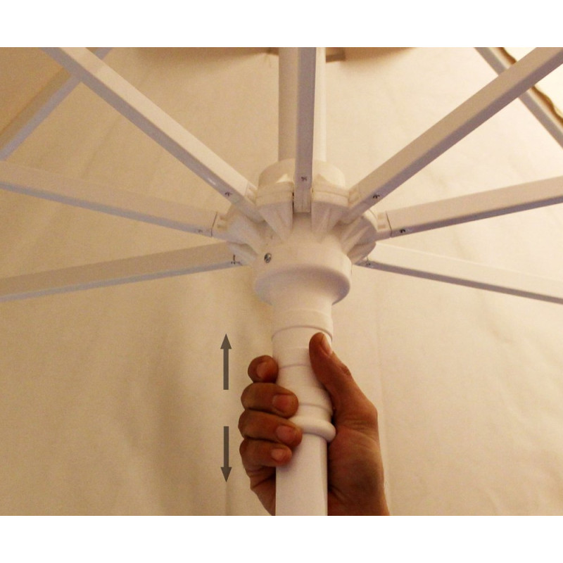 Професійна парасоля захистить від яскравих сонячних променів і створить приємну затінену атмосферу в приватних садах, зони біля басейну, відкритих літніх майданчиках кафе, барів і ресторанів. Виконання купола можливо з трьох тканин: бежевий поліестер, олефін і акрил. Варіанти забарвлення представлені в кольоровій палітрі для тканини олефін і акрил. Покриття опори і спиць можна вибрати з представленої палітри, в чорному кольорі + 10% до вартості виробу. Ціна на сайті вказана за тканину бежевий поліестер, вартість купола з тканини акрил і олефін уточнюйте у менеджера.
