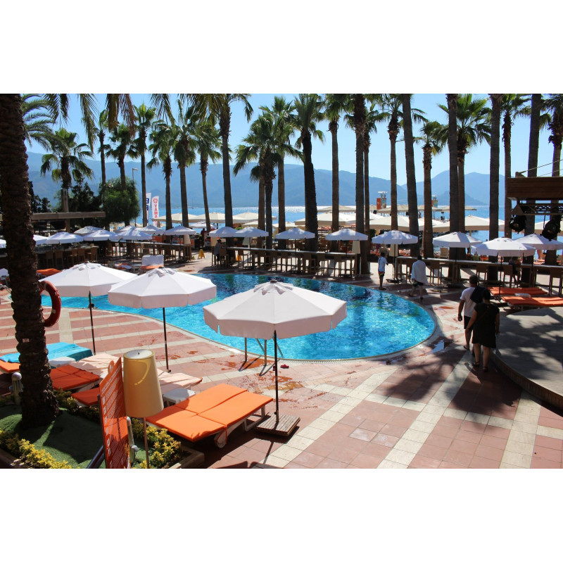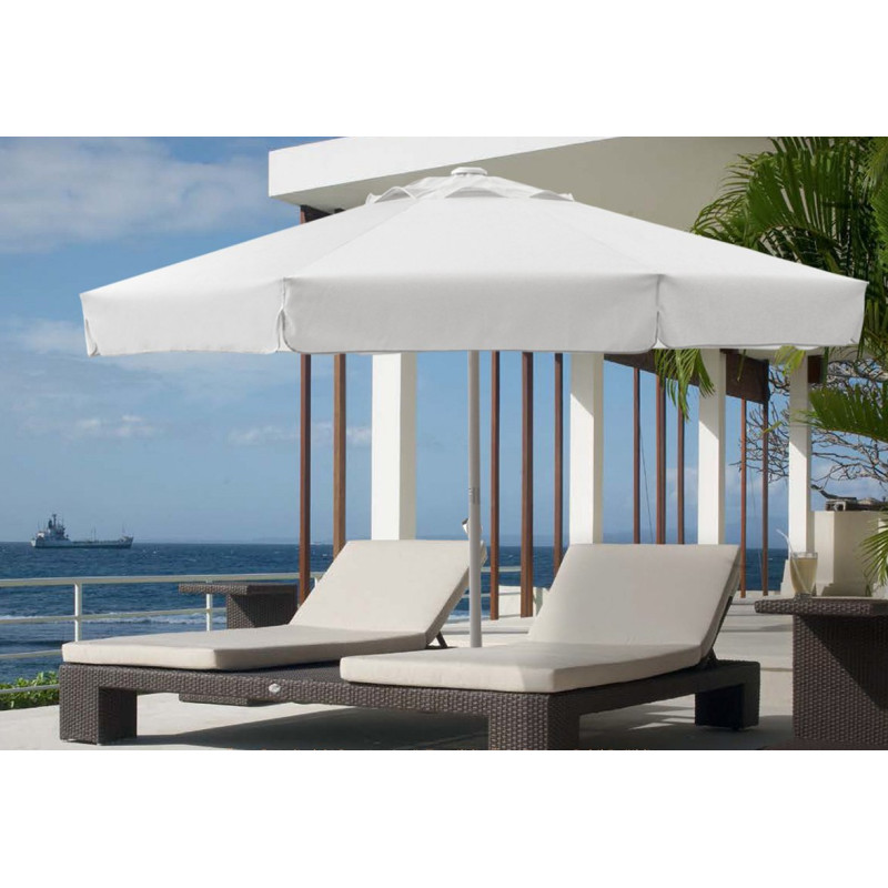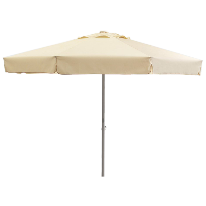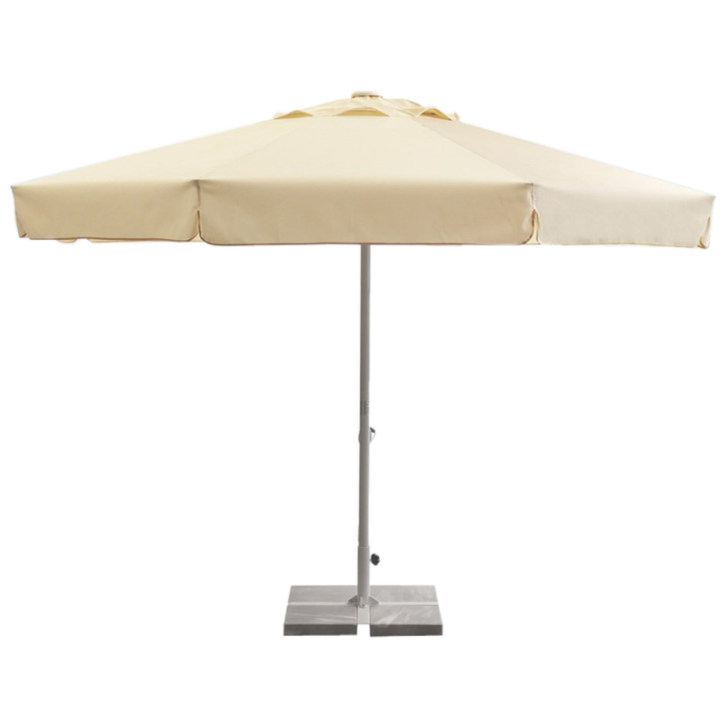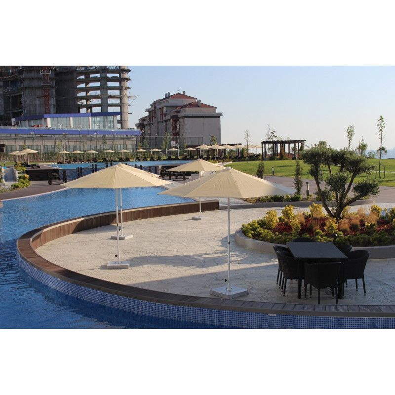 Професійна парасоля захистить від яскравих сонячних променів і створить приємну затінену атмосферу в приватних садах, зони біля басейну, відкритих літніх майданчиках кафе, барів і ресторанів. Виконання купола можливо з трьох тканин: бежевий поліестер, олефін і акрил. Варіанти забарвлення представлені в кольоровій палітрі для тканини олефін і акрил. Покриття опори і спиць можна вибрати з представленої палітри, в чорному кольорі + 10% до вартості виробу. Ціна на сайті вказана за тканину бежевий поліестер, вартість купола з тканини акрил і олефін уточнюйте у менеджера.