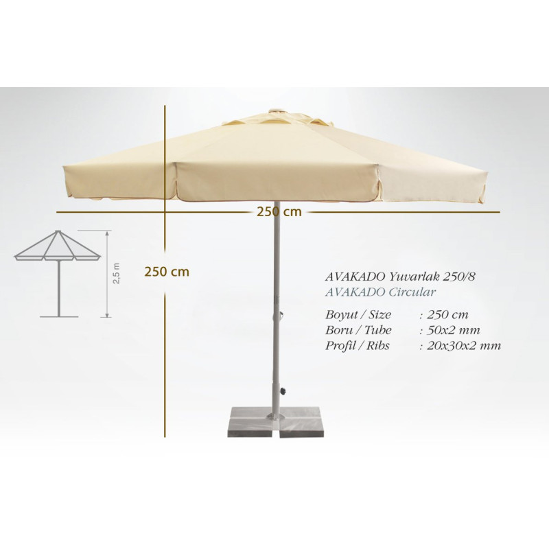 Кольорова палітра купола для тканин олефін і акрил Кольорова палітра опори і спиць Характеристики Довжина/ширина/висота: 250 x 250 x 260 см Вага: 90 кг База: немає Мінімальна вага обважнювача, бази: 70 кг Матеріал купола: поліестер Форма: кругла Колір купола: бежева Висота до кромки відкритого купола: 190 см Щільність тенту: 190 г/м² Механізм відкриття: мотузковий поліспаст Тип: з центральною опорою Діаметр опори: d5 cм (товщина 0,2 см) Матеріал опори: алюміній Кількість спиць: 8 шт. Матеріал спиць: алюміній Розмір перетину спиць: 2 х 3 см, товщина 0,2 см Деталі: цілісний пластик Гарантія: 2 роки Країна виробник: Туреччина Розмір упаковки (ДШВ): 255 x 20 x 20 см