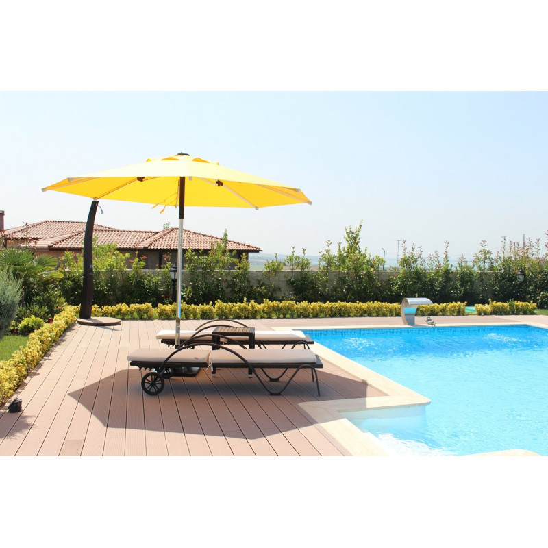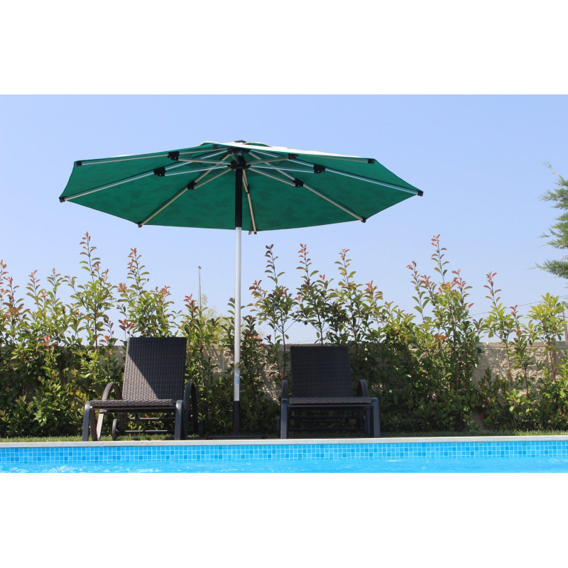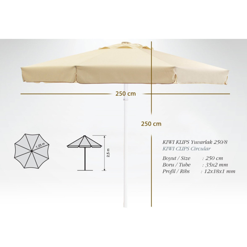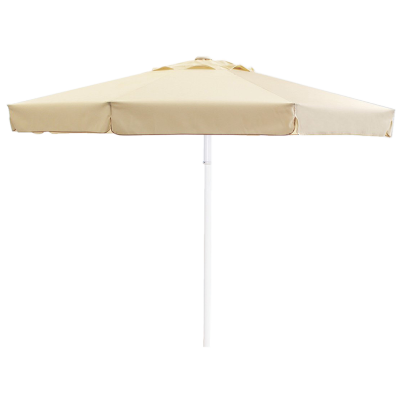 Професійна парасоля захистить від яскравих сонячних променів і створить приємну затінену атмосферу в приватних садах, зони біля басейну, відкритих літніх майданчиках кафе, барів і ресторанів. Виконання купола можливо з трьох тканин: бежевий поліестер, олефін і акрил. Варіанти забарвлення представлені в кольоровій палітрі для тканини олефін і акрил. Покриття опори і спиць можна вибрати з представленої палітри, в чорному кольорі + 10% до вартості виробу. Ціна на сайті вказана за тканину бежевий поліестер, вартість купола з тканини акрил і олефін уточнюйте у менеджера.