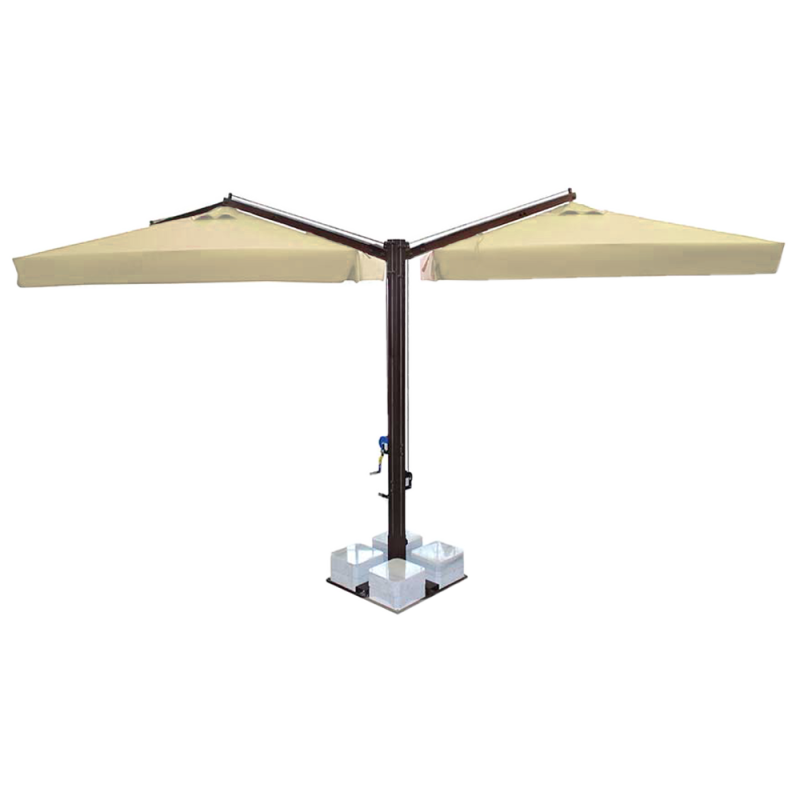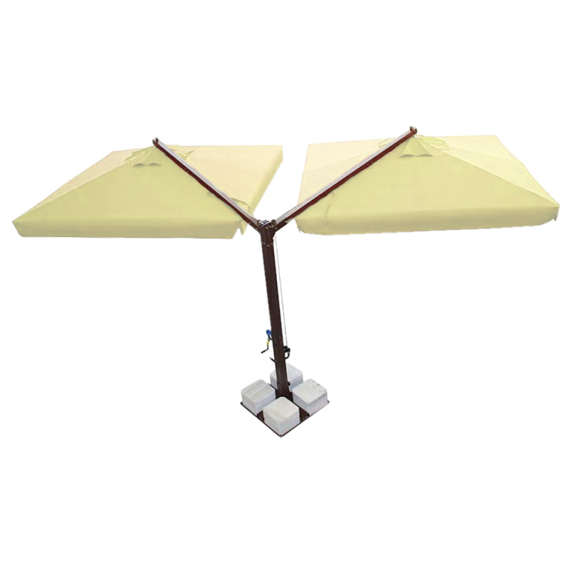 Кольорова палітра купола для тканин олефін і акрил Кольорова палітра опори і спиць Характеристики Довжина/ширина/висота: - x 300 x 310 см База: мармурова 300 кг Мінімальна вага обважнювача, бази: 300 кг Матеріал купола: поліестер Форма: квадратна Колір купола: бежева Висота до кромки відкритого купола: 230 см Щільність тенту: 190 г/м² Механізм відкриття: лебідка ручна Тип: двокупольна Розмір опори: 7 х 7 см (товщина 0,25 см) Матеріал опори: алюміній Кількість спиць: 8 шт. Матеріал спиць: алюміній Розмір перетину спиць: 2 х 3 см, товщина 0,2 см Деталі: цілісний пластик Гарантія: 2 роки Країна виробник: Туреччина