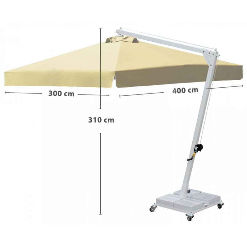 Кольорова палітра купола для тканин олефін і акрил Кольорова палітра опори і спиць Характеристики Довжина/ширина/висота: 300 x 400 x 310 см База: мармурова 160 кг Мінімальна вага обважнювача, бази: 160 кг Матеріал купола: поліестер Форма: прямокутна Колір купола: бежева Висота до кромки відкритого купола: 230 см Щільність тенту: 190 г/м² Механізм відкриття: лебідка ручна Тип: з бічною опорою Розмір опори: 7 х 7 см (товщина 0,25 см) Матеріал опори: алюміній Кількість спиць: 8 шт. Матеріал спиць: алюміній Розмір перетину спиць: 2 х 3 см, товщина 0,2 см Деталі: цілісний пластик Гарантія: 2 роки Країна виробник: Туреччина Розмір упаковки (ДШВ): 265 x 30 x 30 см