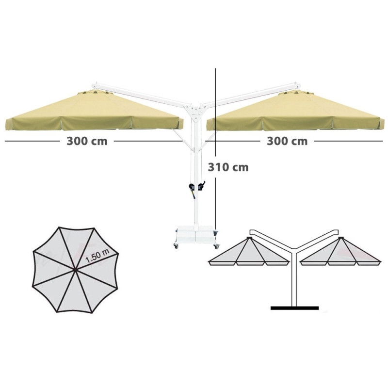 Кольорова палітра купола для тканин олефін і акрил Кольорова палітра опори і спиць Характеристики Довжина/ширина/висота: 600 x 300 x 310 см База: мармурова 300 кг Мінімальна вага обважнювача, бази: 300 кг Матеріал купола: поліестер Форма: кругла Колір купола: бежева Висота до кромки відкритого купола: 230 см Щільність тенту: 190 г/м² Механізм відкриття: лебідка ручна Тип: двокупольна Розмір опори: 7 х 7 см (товщина 0,25 см) Матеріал опори: алюміній Кількість спиць: 8 шт. Матеріал спиць: алюміній Розмір перетину спиць: 2 х 3 см, товщина 0,2 см Деталі: цілісний пластик Гарантія: 2 роки Країна виробник: Туреччина
