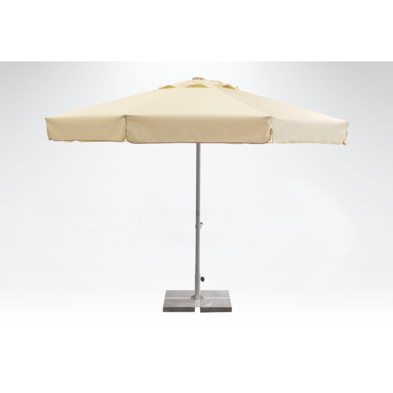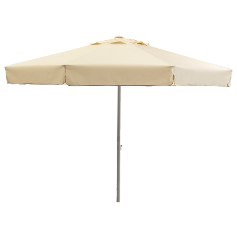 Професійна парасоля захистить від яскравих сонячних променів і створить приємну затінену атмосферу в приватних садах, зони біля басейну, відкритих літніх майданчиках кафе, барів і ресторанів. Виконання купола можливо з трьох тканин: бежевий поліестер, олефін і акрил. Варіанти забарвлення представлені в кольоровій палітрі для тканини олефін і акрил. Покриття опори і спиць можна вибрати з представленої палітри, в чорному кольорі + 10% до вартості виробу. Ціна на сайті вказана за тканину бежевий поліестер, вартість купола з тканини акрил і олефін уточнюйте у менеджера.