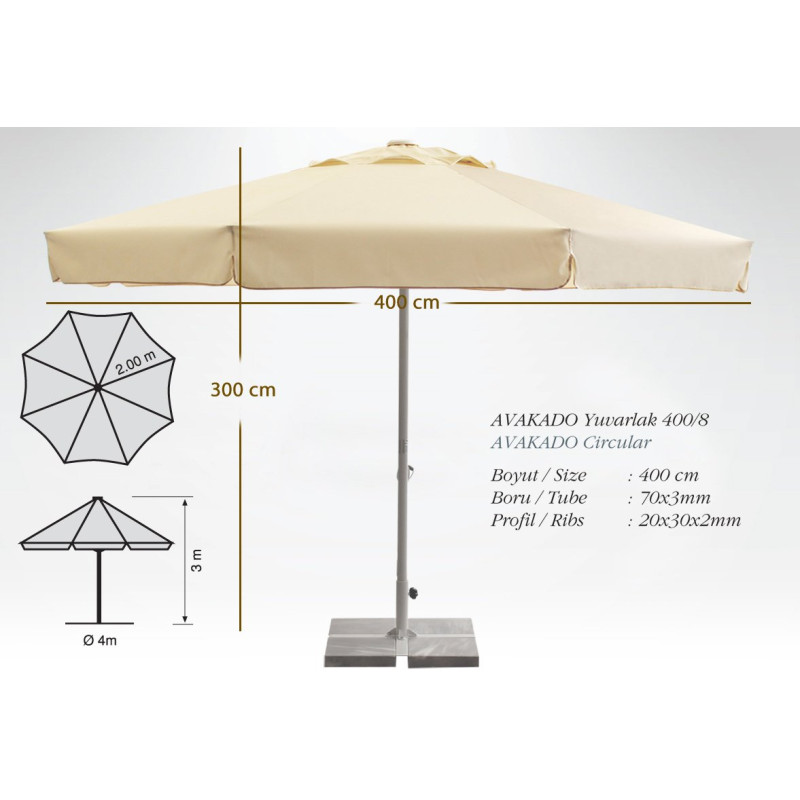 Кольорова палітра купола для тканин олефін і акрил Кольорова палітра опори і спиць Характеристики Довжина/ширина/висота: 400 x 400 x 317 см Вага: 195 кг База: немає Мінімальна вага обважнювача, бази: 160 кг Матеріал купола: поліестер Форма: кругла Колір купола: бежева Висота до кромки відкритого купола: 260 см Щільність тенту: 190 г/м² Механізм відкриття: мотузковий поліспаст Тип: з центральною опорою Діаметр опори: d7 см (товщина 0,3 см) Матеріал опори: алюміній Кількість спиць: 8 шт. Матеріал спиць: алюміній Розмір перетину спиць: 2 x 3 см, товщина 0,2 см Деталі: цілісний пластик Гарантія: 2 роки Країна виробник: Туреччина Розмір упаковки (ДШВ): 300 x 30 x 30 см
