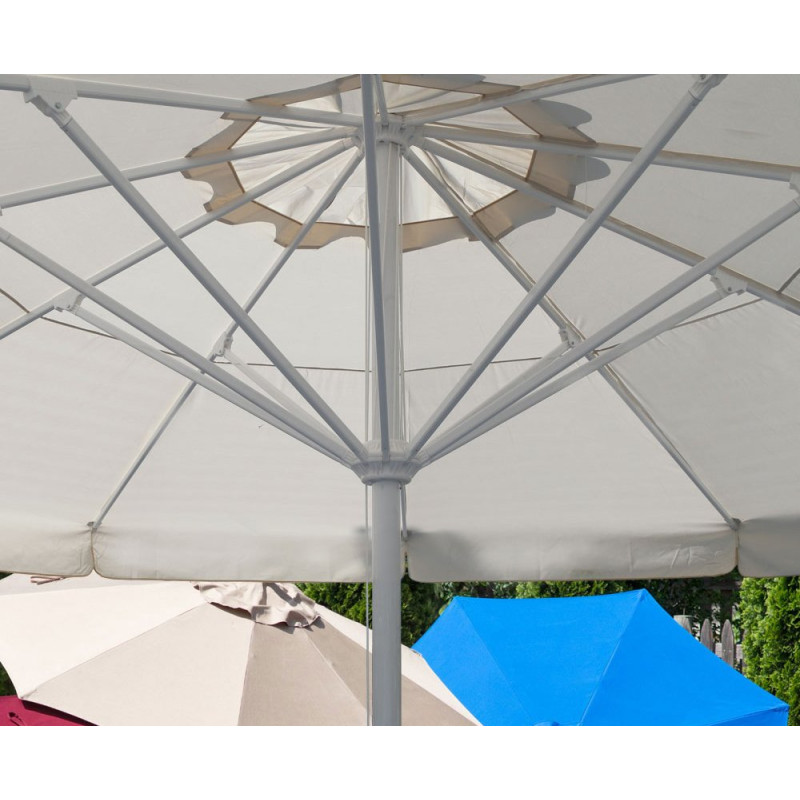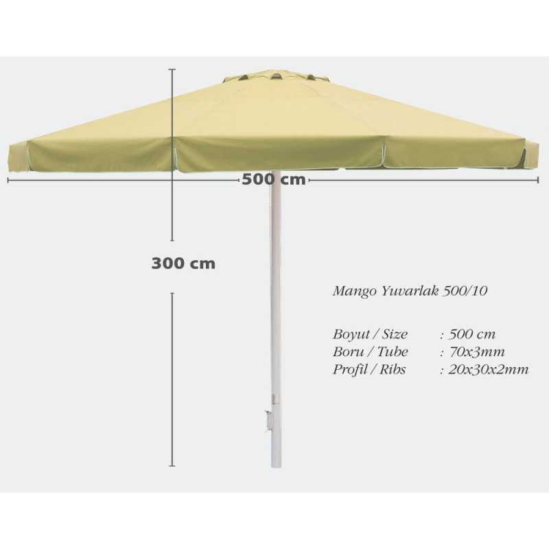 Кольорова палітра купола для тканин олефін і акрил Кольорова палітра опори і спиць Характеристики Довжина/ширина/висота: 500 x 500 x 300 см База: немає Мінімальна вага обважнювача, бази: 160 кг Матеріал купола: поліестер Форма: кругла Колір купола: бежева Висота до кромки відкритого купола: 300 см Щільність тенту: 190 г/м² Механізм відкриття: мотузковий поліспаст Тип: з центральною опорою Діаметр опори: Ø 7 см Матеріал опори: алюміній Кількість спиць: 10 шт. Матеріал спиць: алюміній Розмір перетину спиць: 2 x 3 см Деталі: цілісний пластик Гарантія: 2 роки Країна виробник: Туреччина