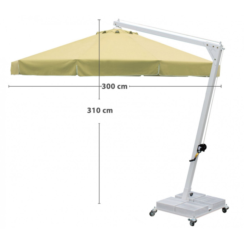Кольорова палітра купола для тканин олефін і акрил Кольорова палітра опори і спиць Характеристики Довжина/ширина/висота: 300 x 300 x 310 см Вага: 205 кг База: мармурова 160 кг Мінімальна вага обважнювача, бази: 150 кг Матеріал купола: поліестер Форма: кругла Колір купола: бежева Висота до кромки відкритого купола: 230 см Щільність тенту: 190 г/м² Механізм відкриття: лебідка ручна Тип: з бічною опорою Діаметр опори: Ø 7 см Матеріал опори: алюміній Кількість спиць: 8 шт. Матеріал спиць: алюміній Розмір перетину спиць: 2 x 3 см Деталі: цілісний пластик Гарантія: 2 роки Країна виробник: Туреччина Розмір упаковки (ДШВ): 265 x 30 x 30 см