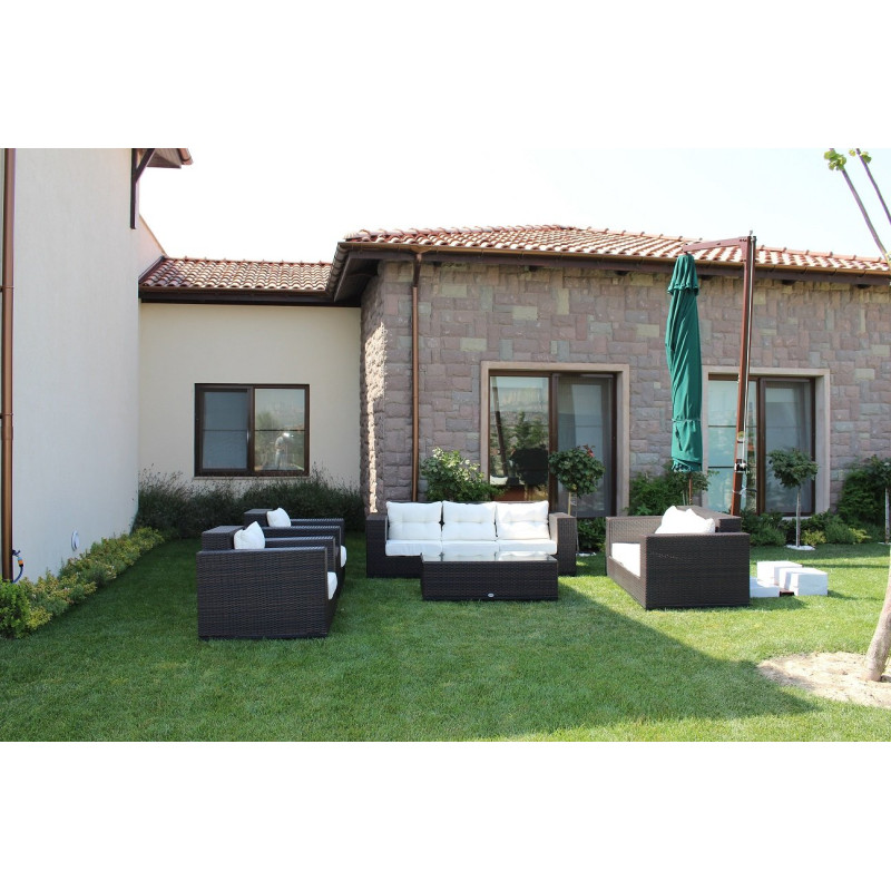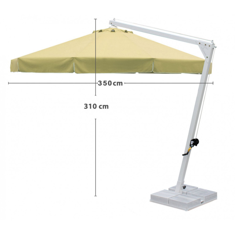 Кольорова палітра купола для тканин олефін і акрил Кольорова палітра опори і спиць Характеристики Довжина/ширина/висота: 350 x 350 x 310 см Вага: 215 кг База: мармурова 160 кг Мінімальна вага обважнювача, бази: 160 кг Матеріал купола: поліестер Форма: кругла Колір купола: бежева Висота до кромки відкритого купола: 230 см Щільність тенту: 190 г/м² Механізм відкриття: лебідка ручна Тип: з бічною опорою Діаметр опори: Ø 7 см Матеріал опори: алюміній Кількість спиць: 8 шт. Матеріал спиць: алюміній Розмір перетину спиць: 2 x 3 см Деталі: цілісний пластик Гарантія: 2 роки Країна виробник: Туреччина Розмір упаковки (ДШВ): 265 x 30 x 30 см