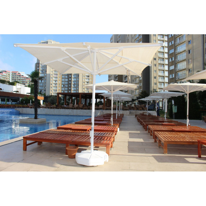 Професійна парасоля захистить від яскравих сонячних променів і створить приємну затінену атмосферу в приватних садах, зони біля басейну, відкритих літніх майданчиках кафе, барів і ресторанів. Виконання купола можливо з трьох тканин: бежевий поліестер, олефін і акрил. Варіанти забарвлення представлені в кольоровій палітрі для тканини олефін і акрил. Покриття опори і спиць можна вибрати з представленої палітри, в чорному кольорі + 10% до вартості виробу. Ціна на сайті вказана за тканину бежевий поліестер, вартість купола з тканини акрил і олефін уточнюйте у менеджера.