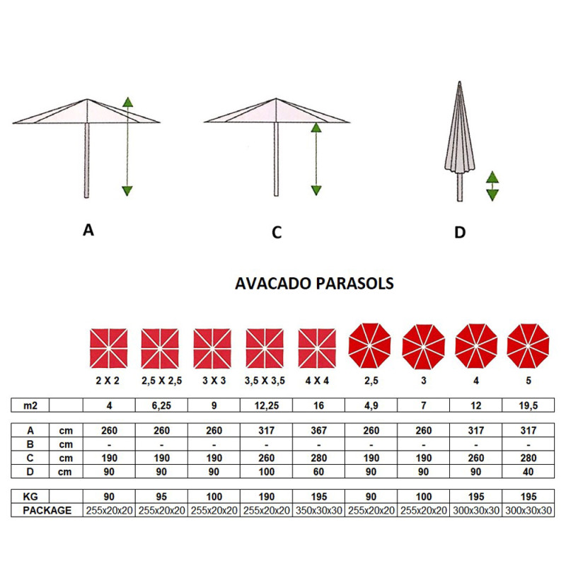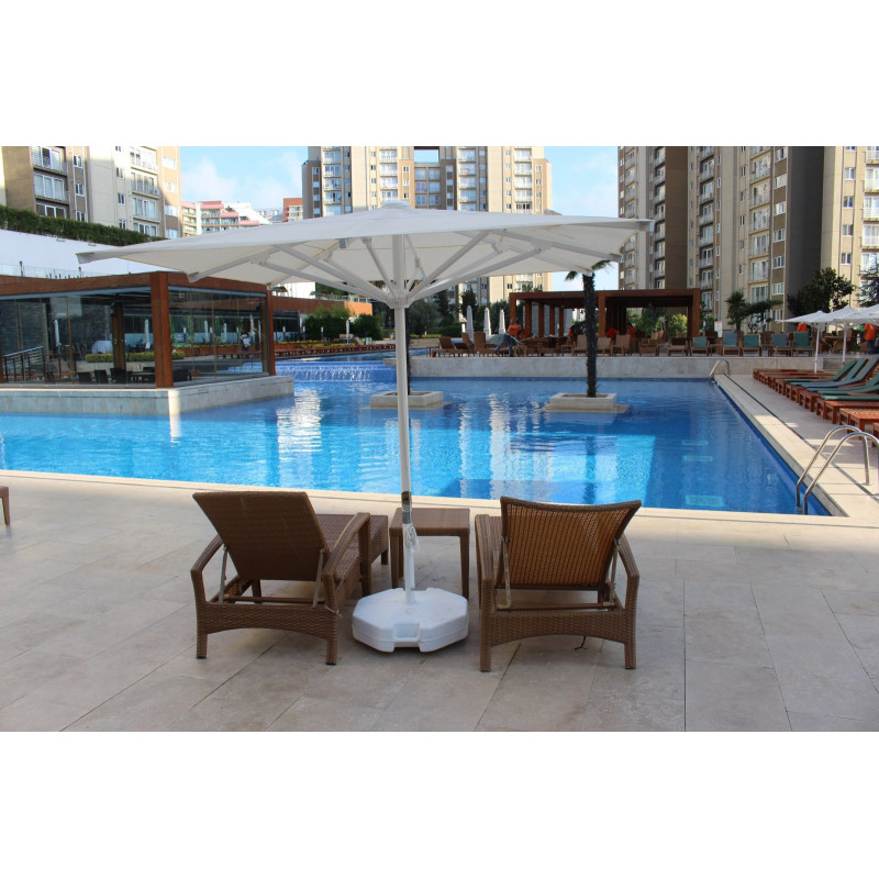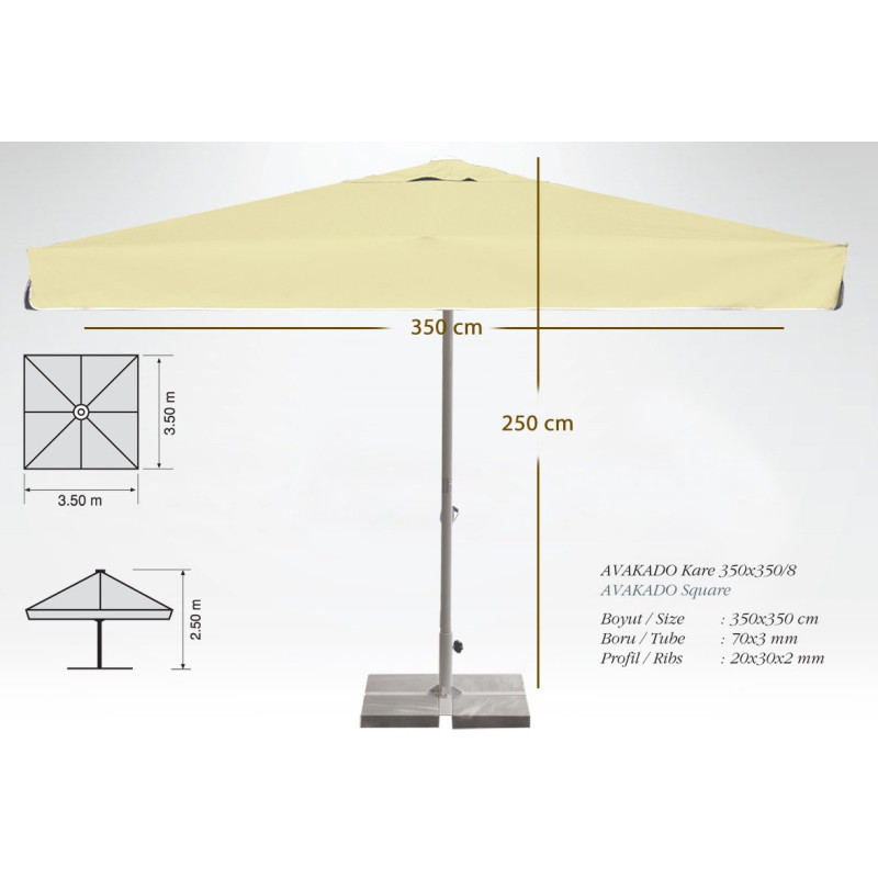 Кольорова палітра купола для тканин олефін і акрил Кольорова палітра опори і спиць Характеристики Довжина/ширина/висота: 350 x 350 x 317 см Вага: 190 кг База: немає Мінімальна вага обважнювача, бази: 160 кг Матеріал купола: поліестер Форма: квадратна Колір купола: бежева Висота до кромки відкритого купола: 260 см Щільність тенту: 190 г/м² Механізм відкриття: мотузковий поліспаст Тип: з центральною опорою Діаметр опори: d7 см (товщина 0,2 см) Матеріал опори: алюміній Кількість спиць: 8 шт. Матеріал спиць: алюміній Розмір перетину спиць: 2 x 3 см, товщина 0,2 см Деталі: цілісний пластик Гарантія: 2 роки Країна виробник: Туреччина Розмір упаковки (ДШВ): 255 x 20 x 20 см