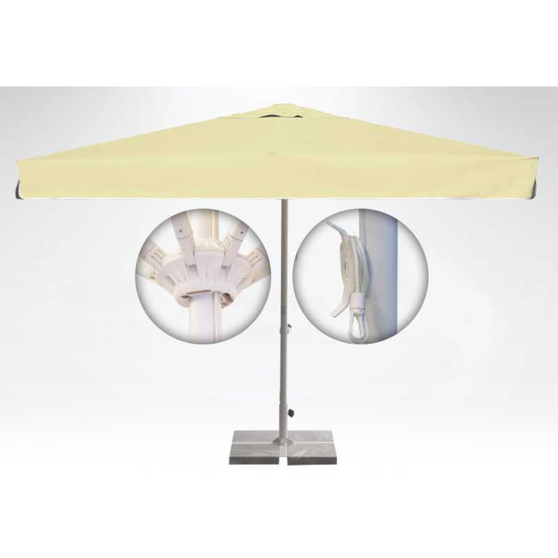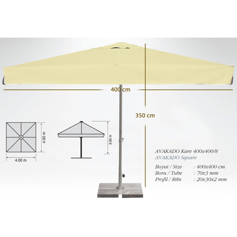 Кольорова палітра купола для тканин олефін і акрил Кольорова палітра опори і спиць Характеристики Довжина/ширина/висота: 400 x 400 x 367 см Вага: 195 кг База: немає Мінімальна вага обважнювача, бази: 160 кг Матеріал купола: поліестер Форма: квадратна Колір купола: бежева Висота до кромки відкритого купола: 280 см Щільність тенту: 190 г/м² Механізм відкриття: мотузковий поліспаст Тип: з центральною опорою Діаметр опори: d7 см (товщина 0,3 см) Матеріал опори: алюміній Кількість спиць: 8 шт. Матеріал спиць: алюміній Розмір перетину спиць: 2 x 3 см, товщина 0,2 см Деталі: цілісний пластик Гарантія: 2 роки Країна виробник: Туреччина Розмір упаковки (ДШВ): 350 x 30 x 30 см